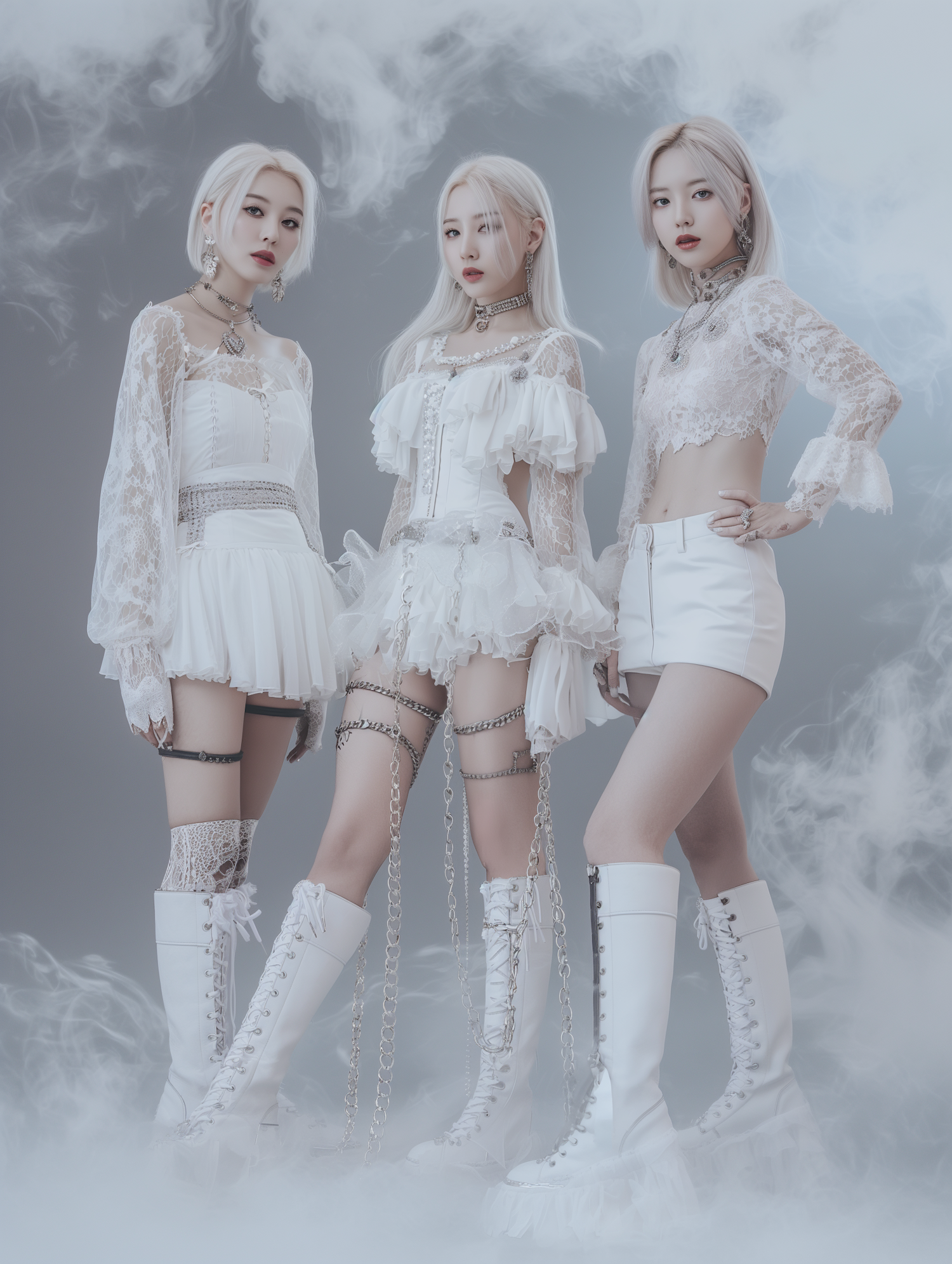 Three women in white lace outfits and boots stand in a misty setting, exuding elegance and strength with platinum blonde hair and silver accessories.