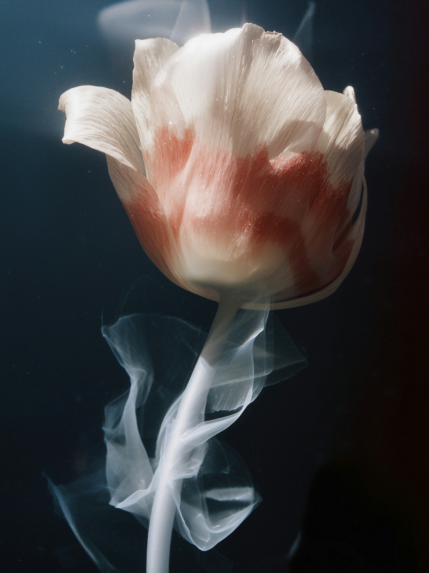 A close-up of a tulip with white and pink petals, surrounded by flowing translucent fabric, set against a dark background.
