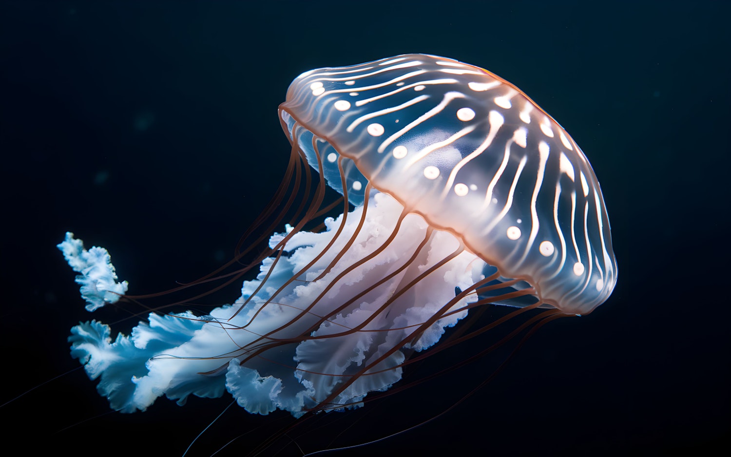 Graceful jellyfish with glowing patterns and delicate tentacles in a deep blue ocean, creating a tranquil and captivating scene.