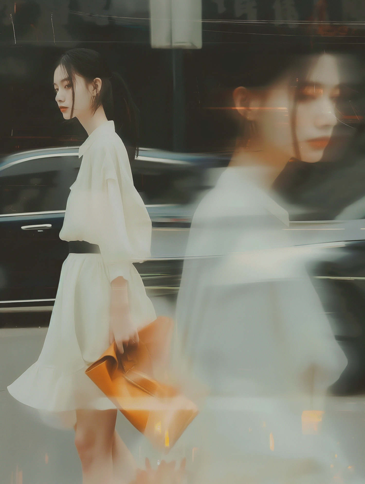 Elegant Asian woman in white dress with orange handbag, walking with reflection effect. Modern style and artistic blur.