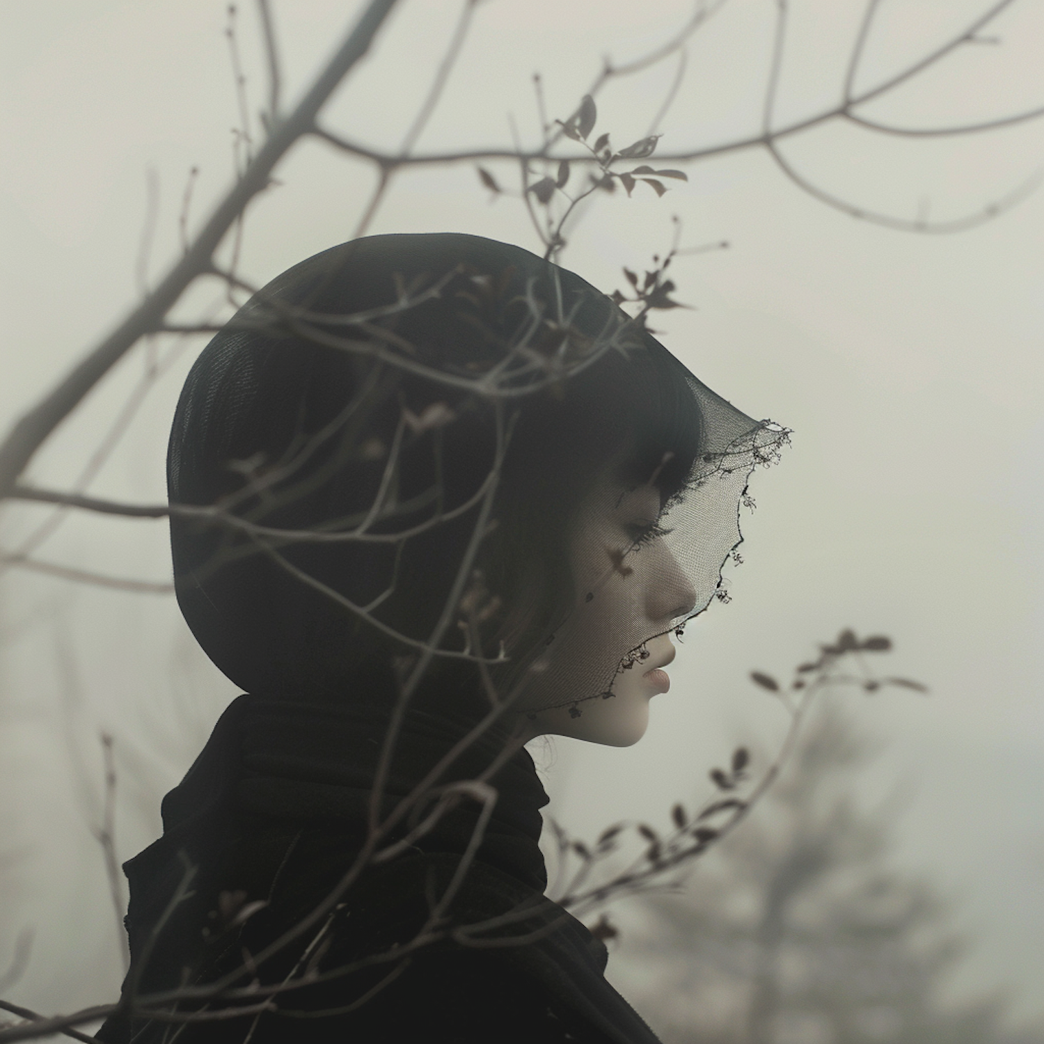 Ethereal portrait of a veiled woman in a misty landscape, surrounded by bare branches, exuding serenity and contemplation.