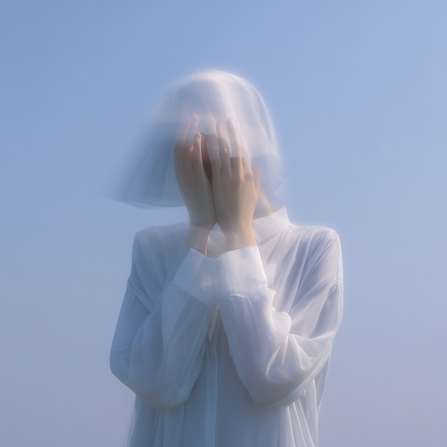 A serene, ethereal portrait of a veiled figure in white against a clear blue sky, evoking a dreamlike and tranquil atmosphere.
