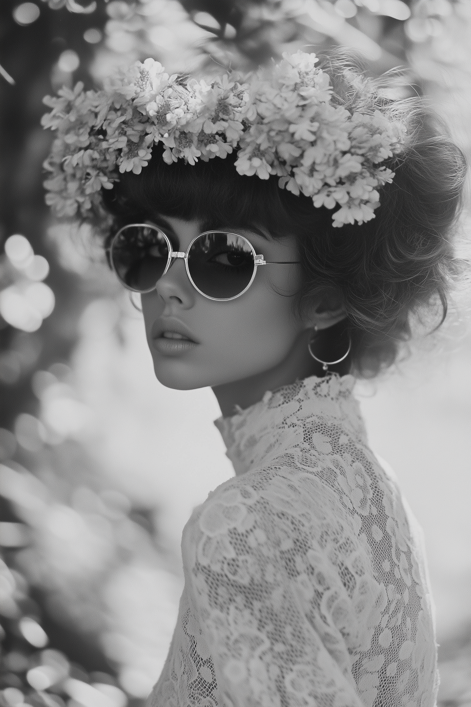 Black and white portrait of a person in a lace dress with a floral crown, emphasizing vintage elegance and intricate textures.