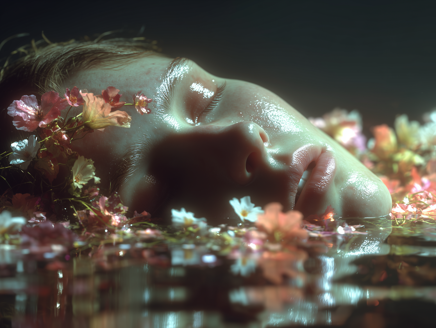 A serene close-up of a face partially submerged in water, surrounded by floating flowers in soft, glowing light.