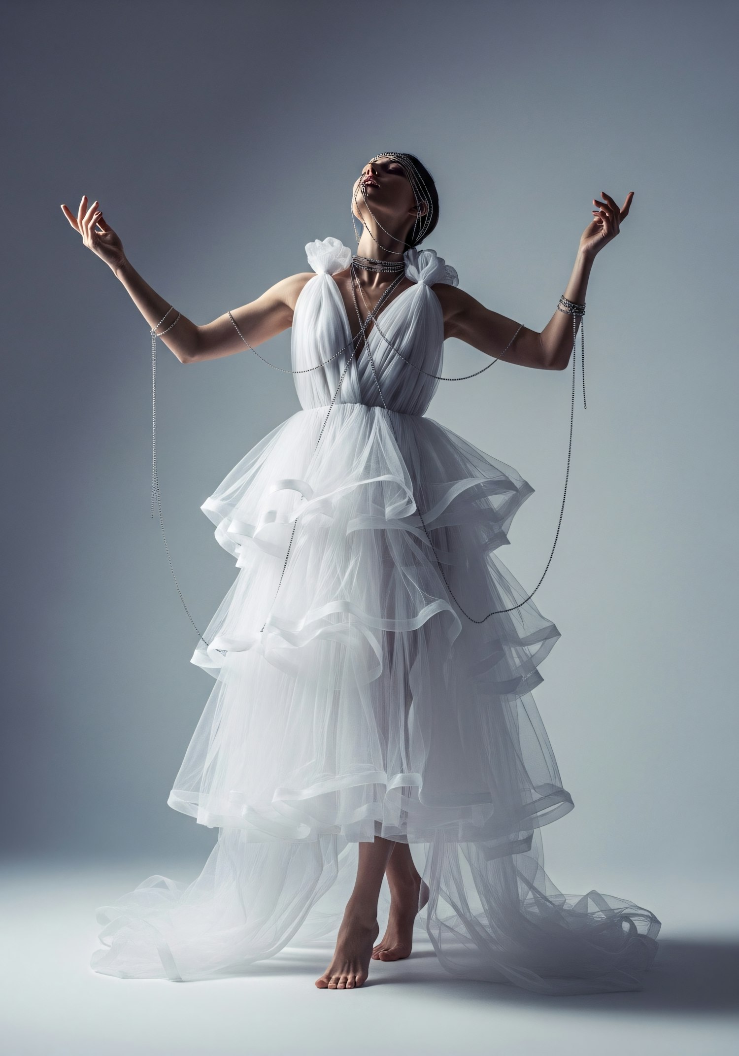 A person in a layered white tulle dress poses barefoot with arms raised, adorned with delicate chains, against a soft neutral background.