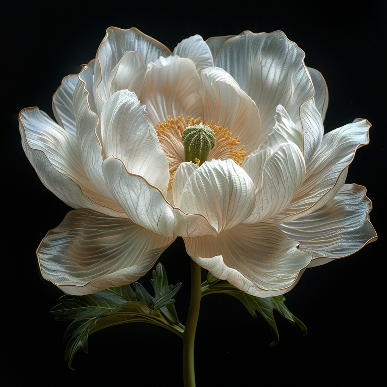 Close-up of a delicate white flower with translucent petals and golden edges, set against a dark background.