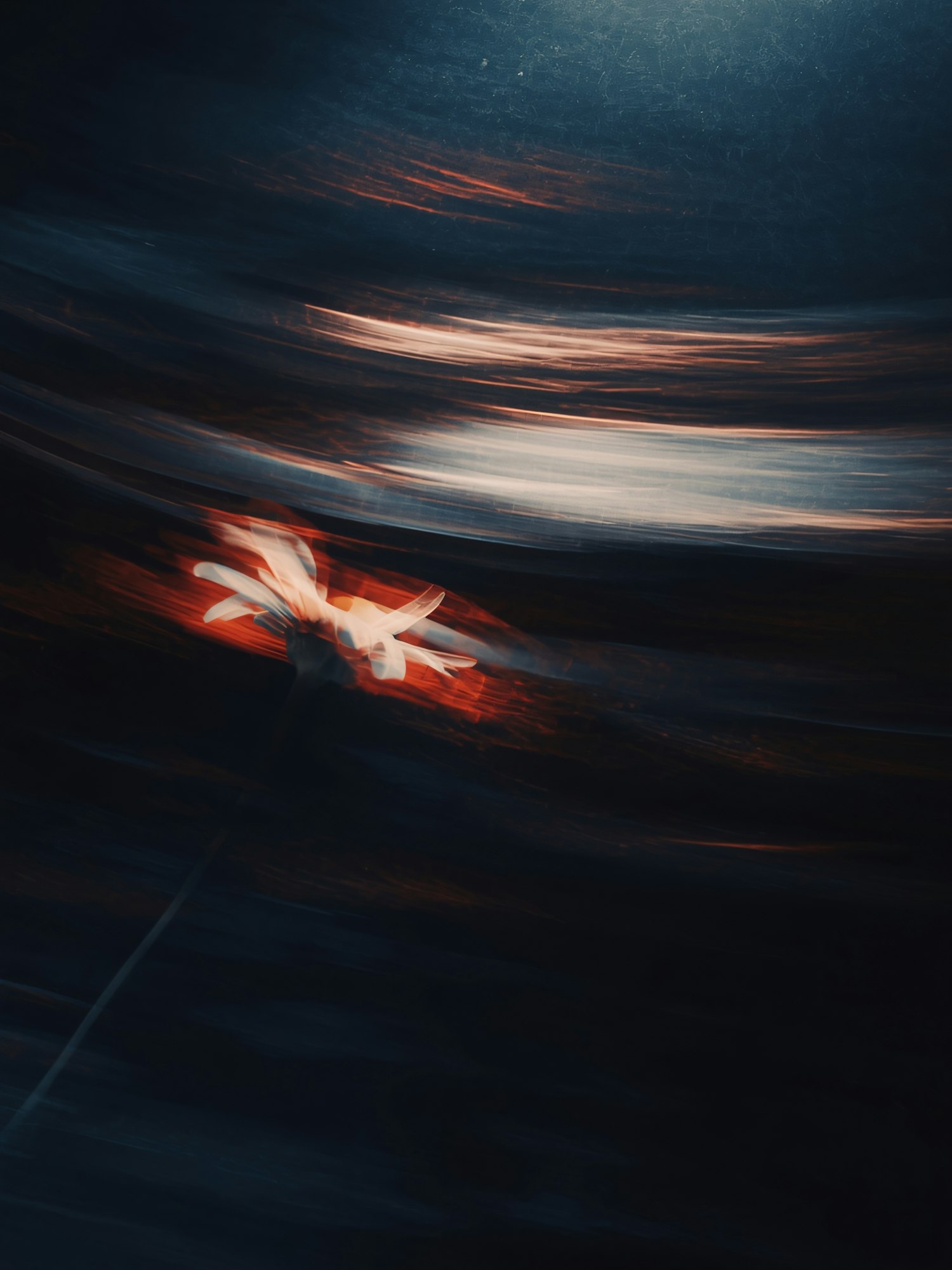 A single white flower illuminated in warm light against a dark, abstract background with dynamic motion blur effects.