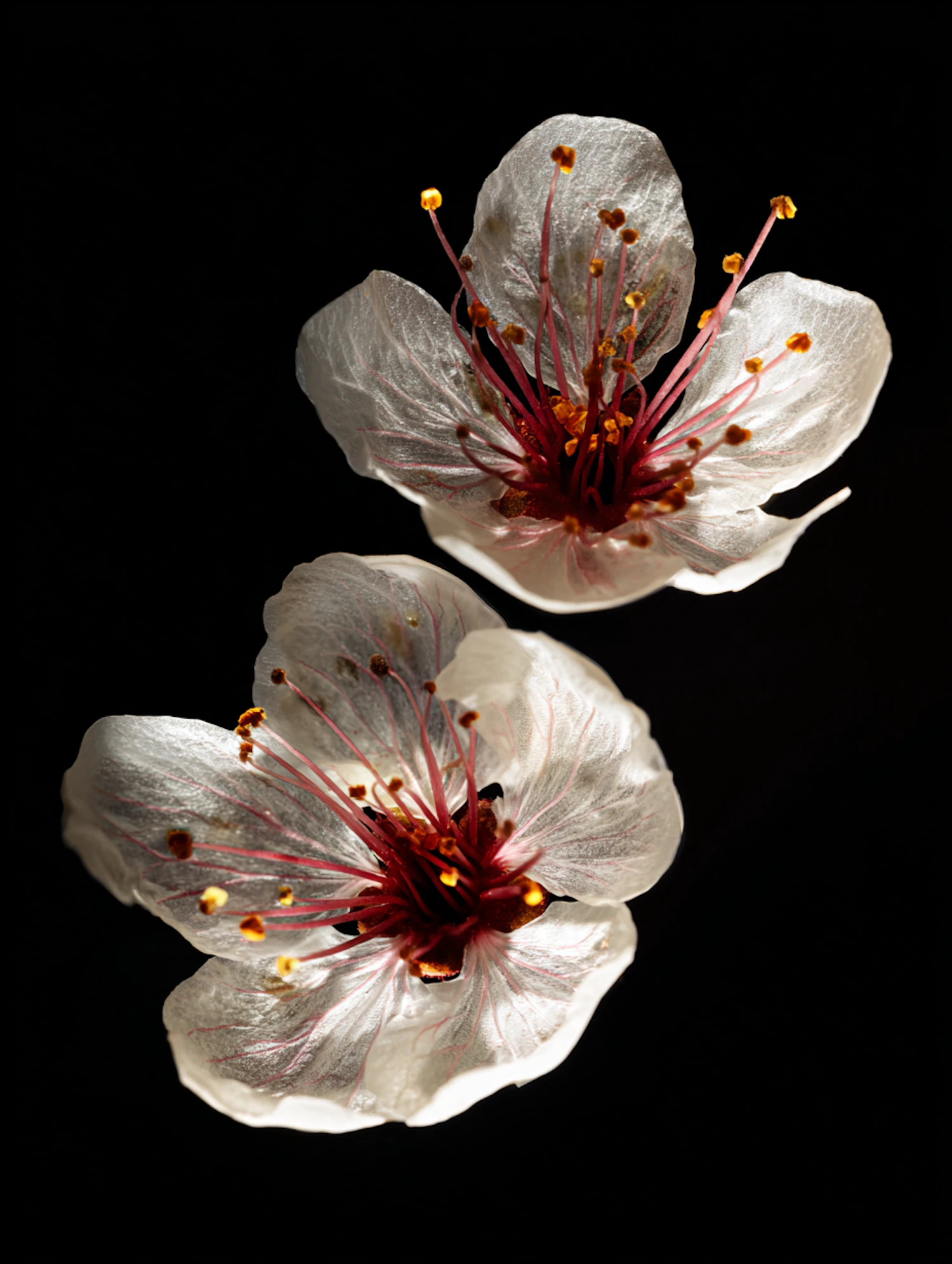 Close-up of two white flowers with red stamens and yellow pollen, set against a dark background, showcasing their delicate details.