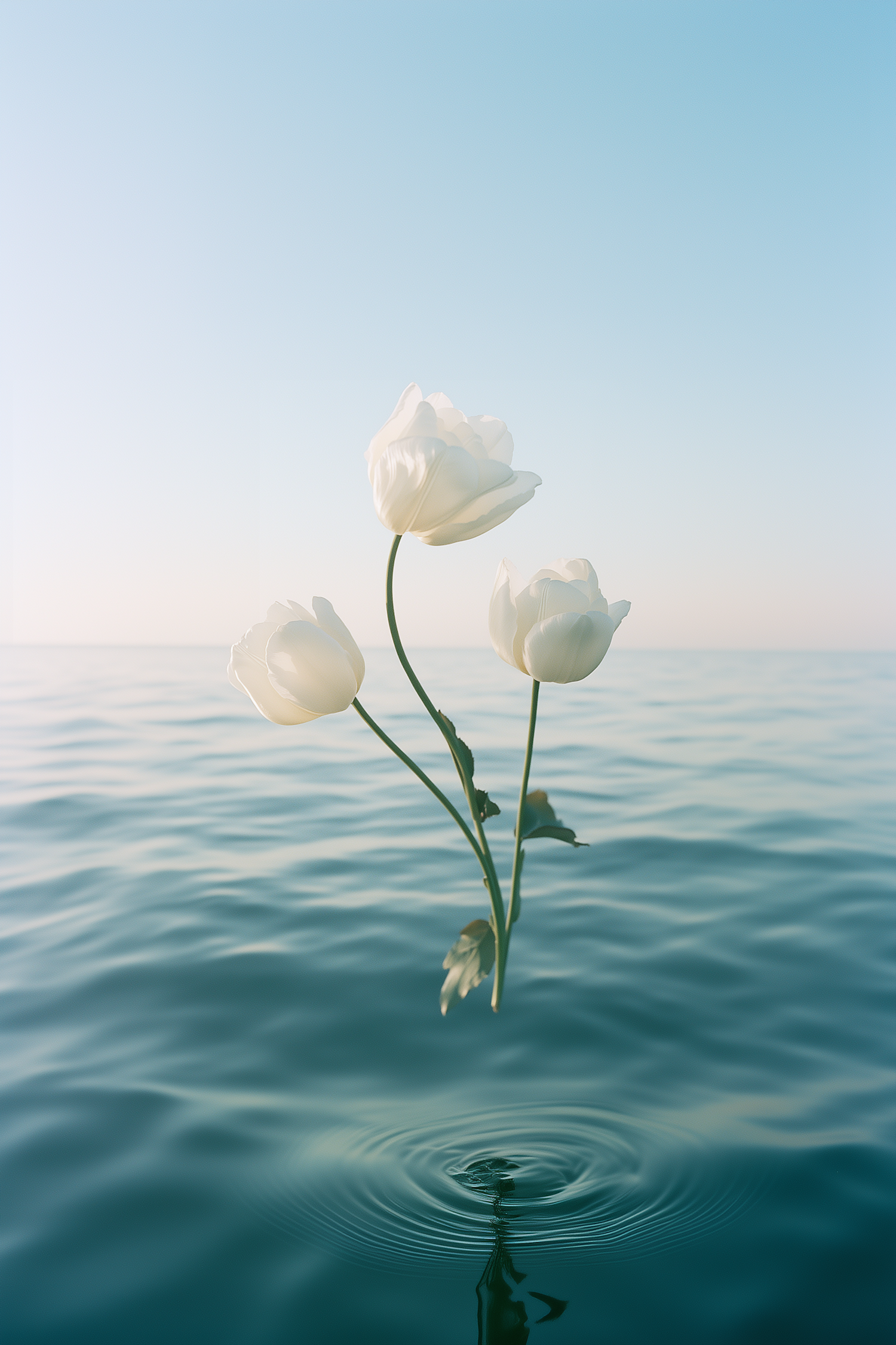 Three white tulips float above calm water, their reflection creating ripples. A serene blue sky and soft horizon complete the tranquil scene.