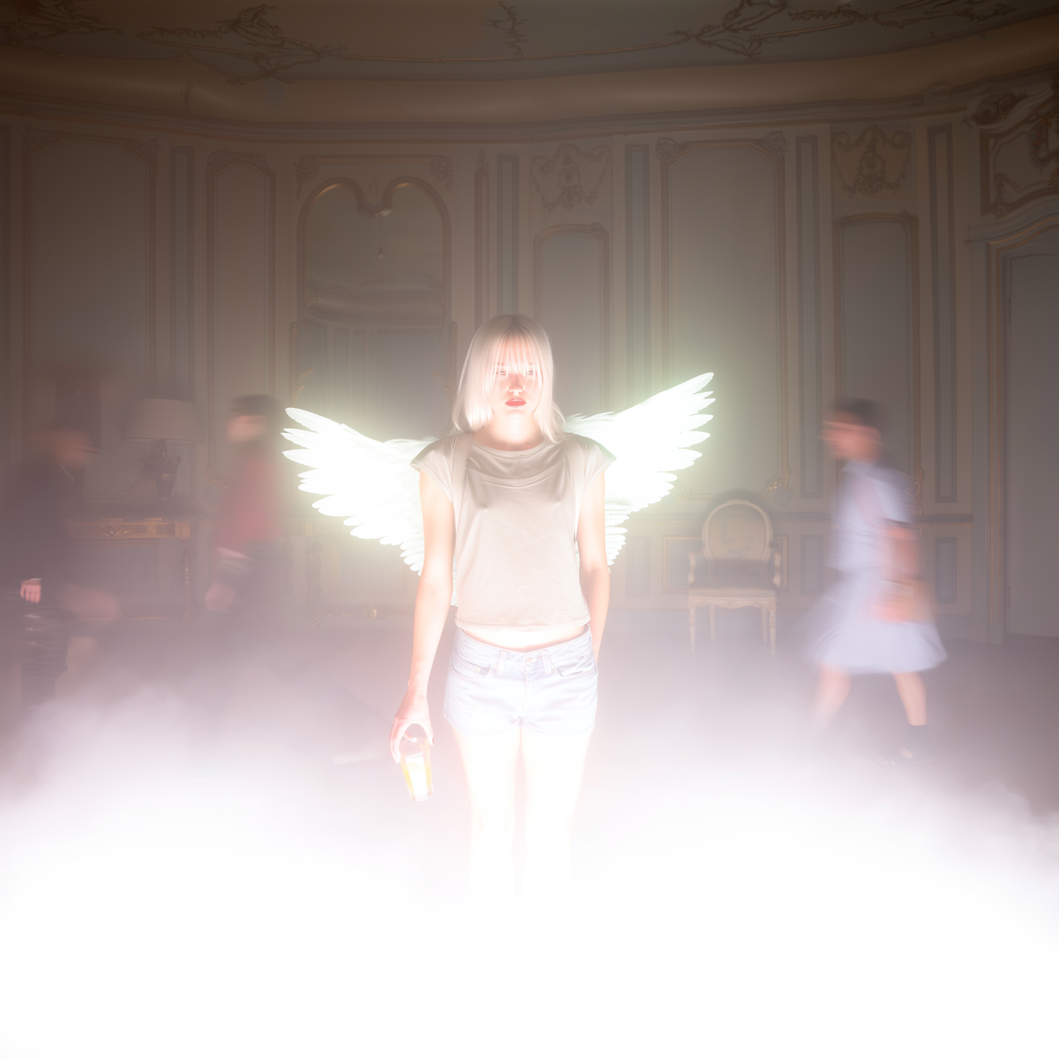 A person with glowing wings stands in a misty, ornate room, holding an object, with blurred figures in the background.