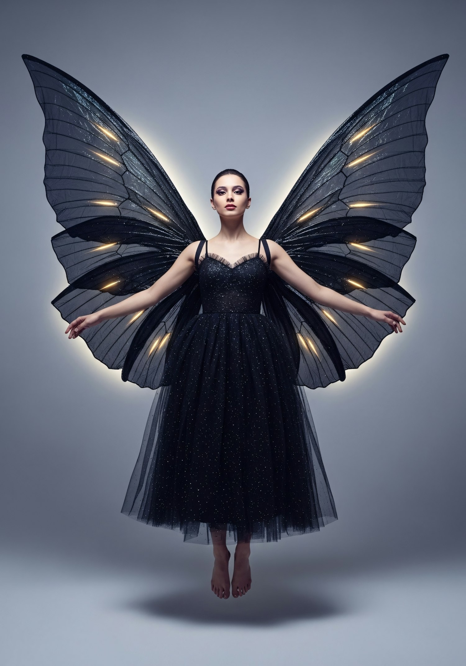 A woman in a black sparkling dress with glowing black wings stands gracefully against a soft gray background.
