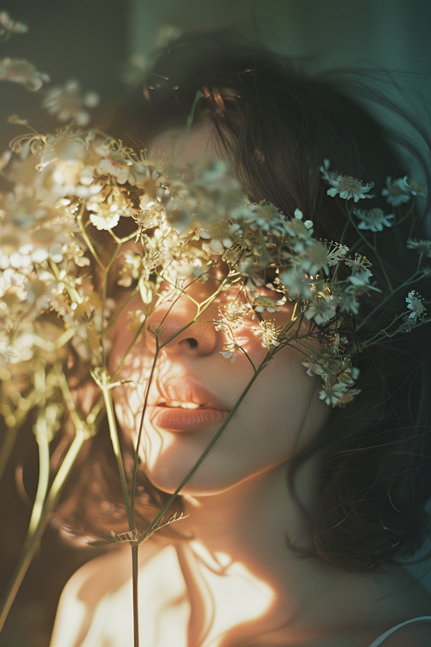Ethereal portrait of a woman with flowers casting shadows on her face, creating a dreamy, soft-focus effect.
