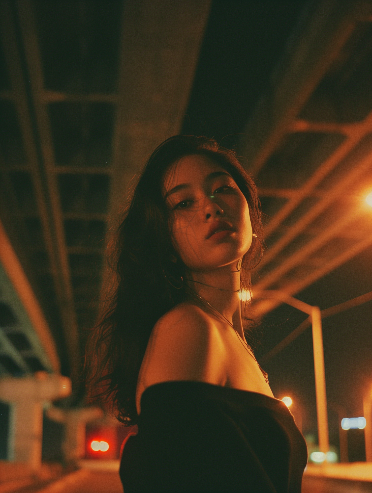 Moody nighttime portrait of a young woman under an overpass, illuminated by warm streetlights, creating a dramatic urban atmosphere.