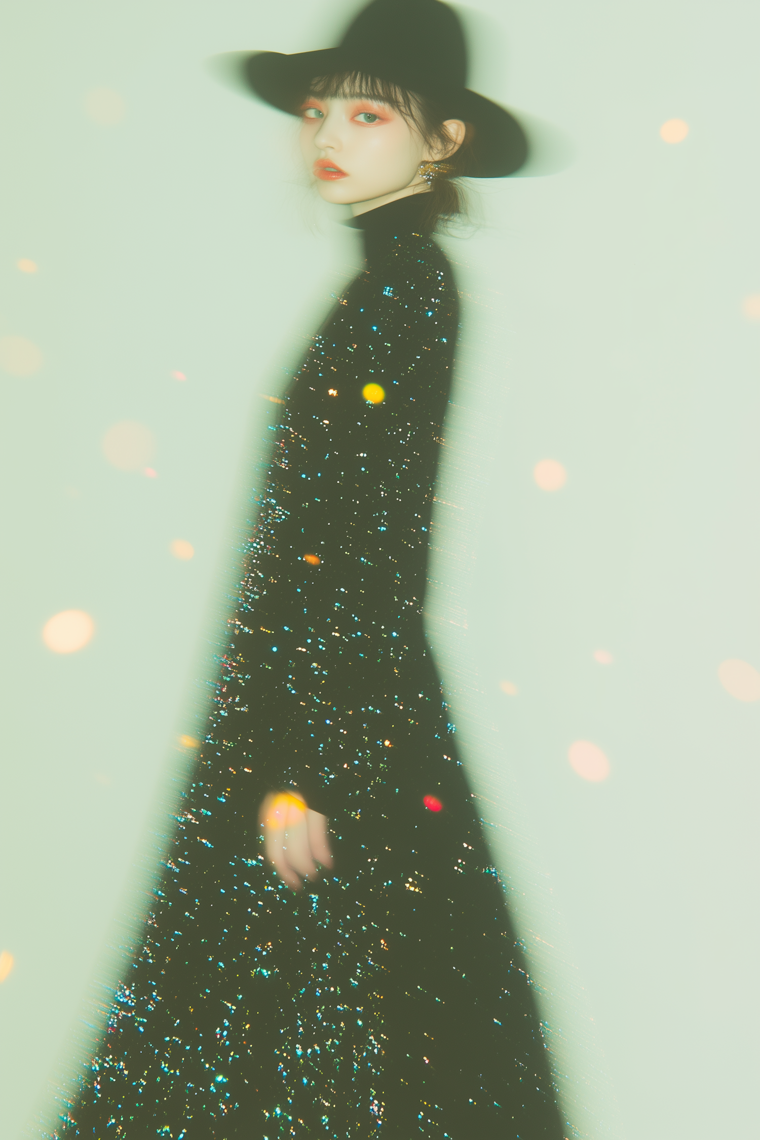 A woman in a sparkling black dress and wide-brimmed hat, with bold red makeup, stands against a dreamy pale green background with bokeh lights.