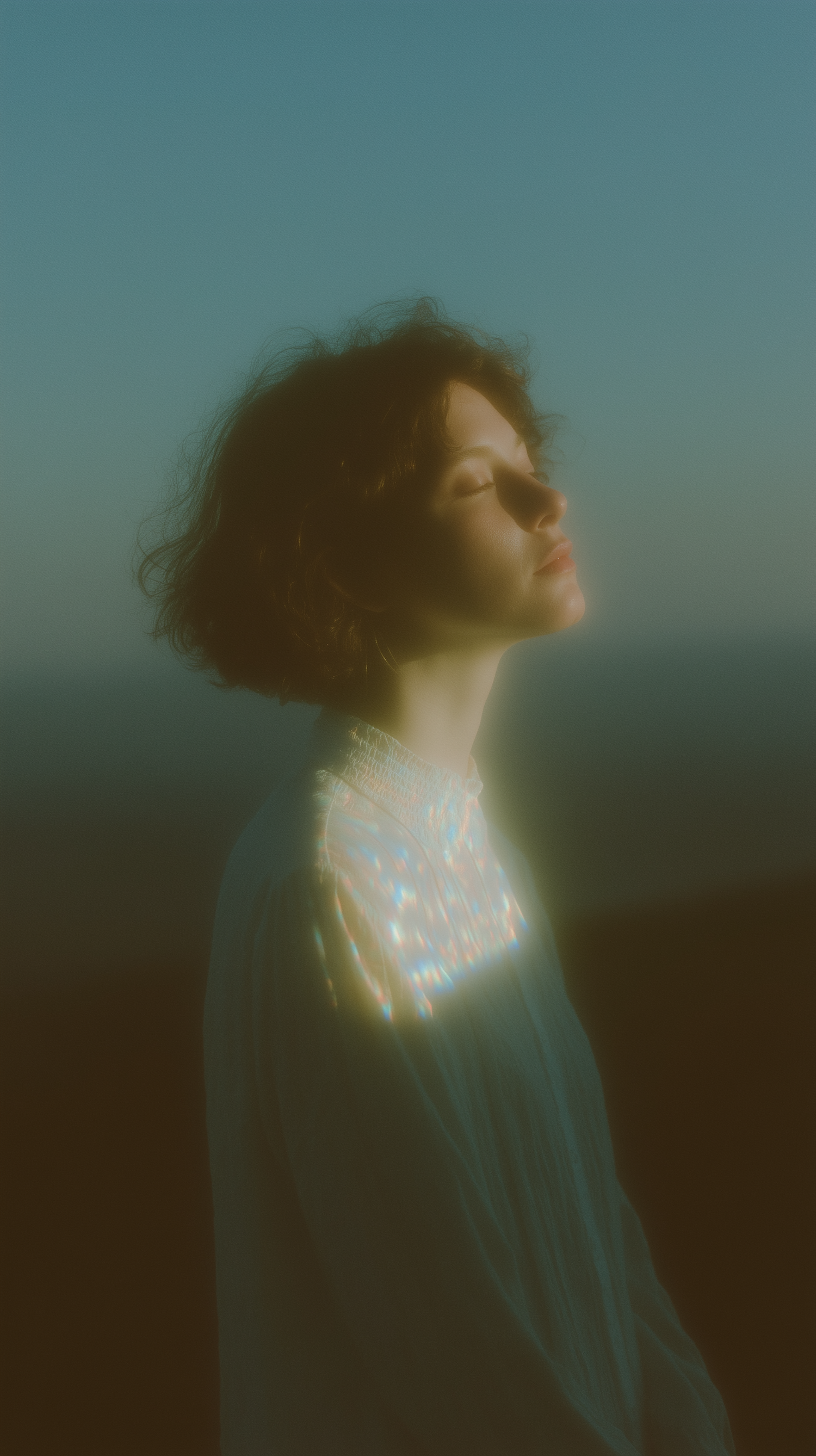 Dreamy portrait of a woman in soft light, wearing a white blouse with rainbow reflections on her shoulder against a serene backdrop.