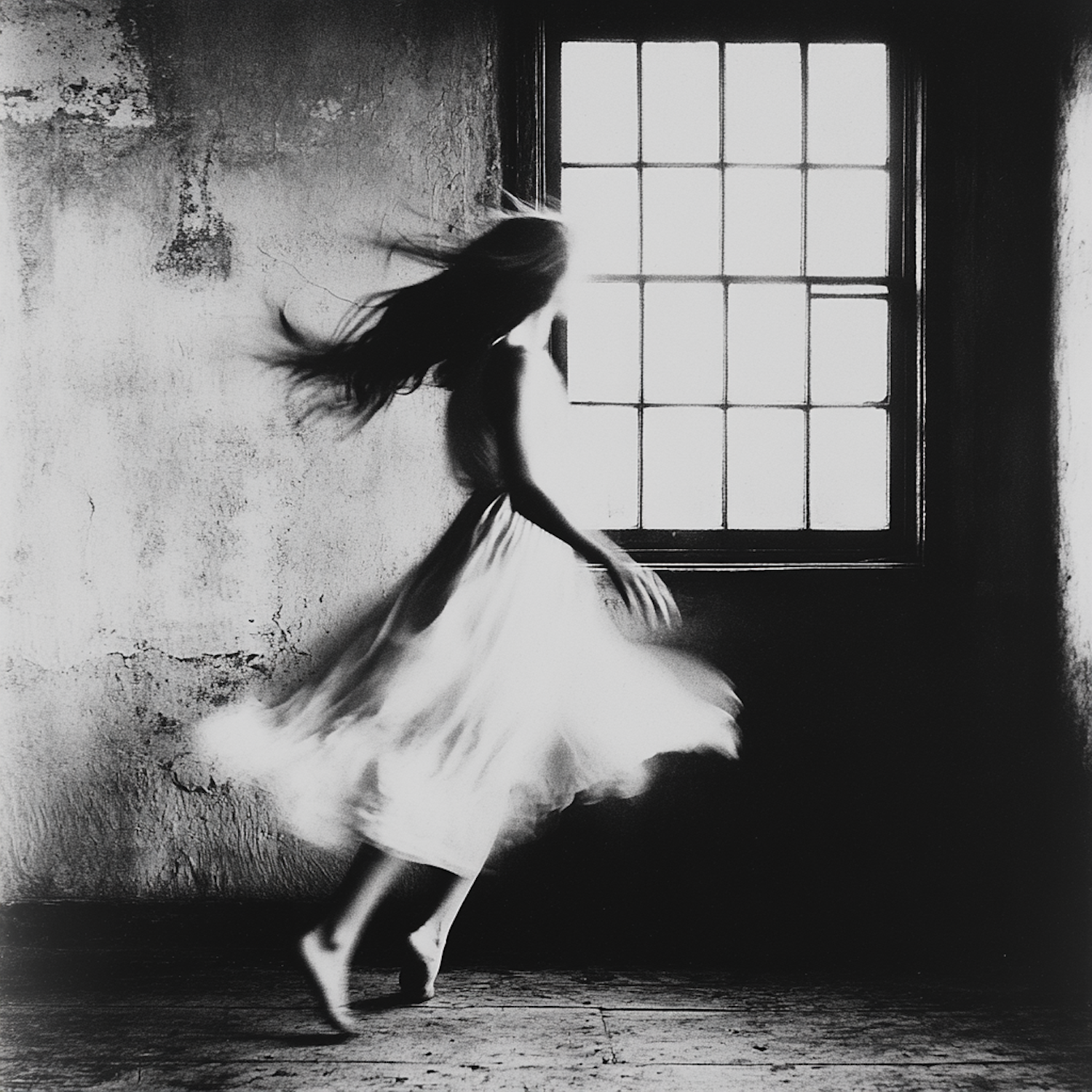 A hauntingly beautiful black-and-white photo of a woman spinning in a dimly lit room with a textured wall and a large window.