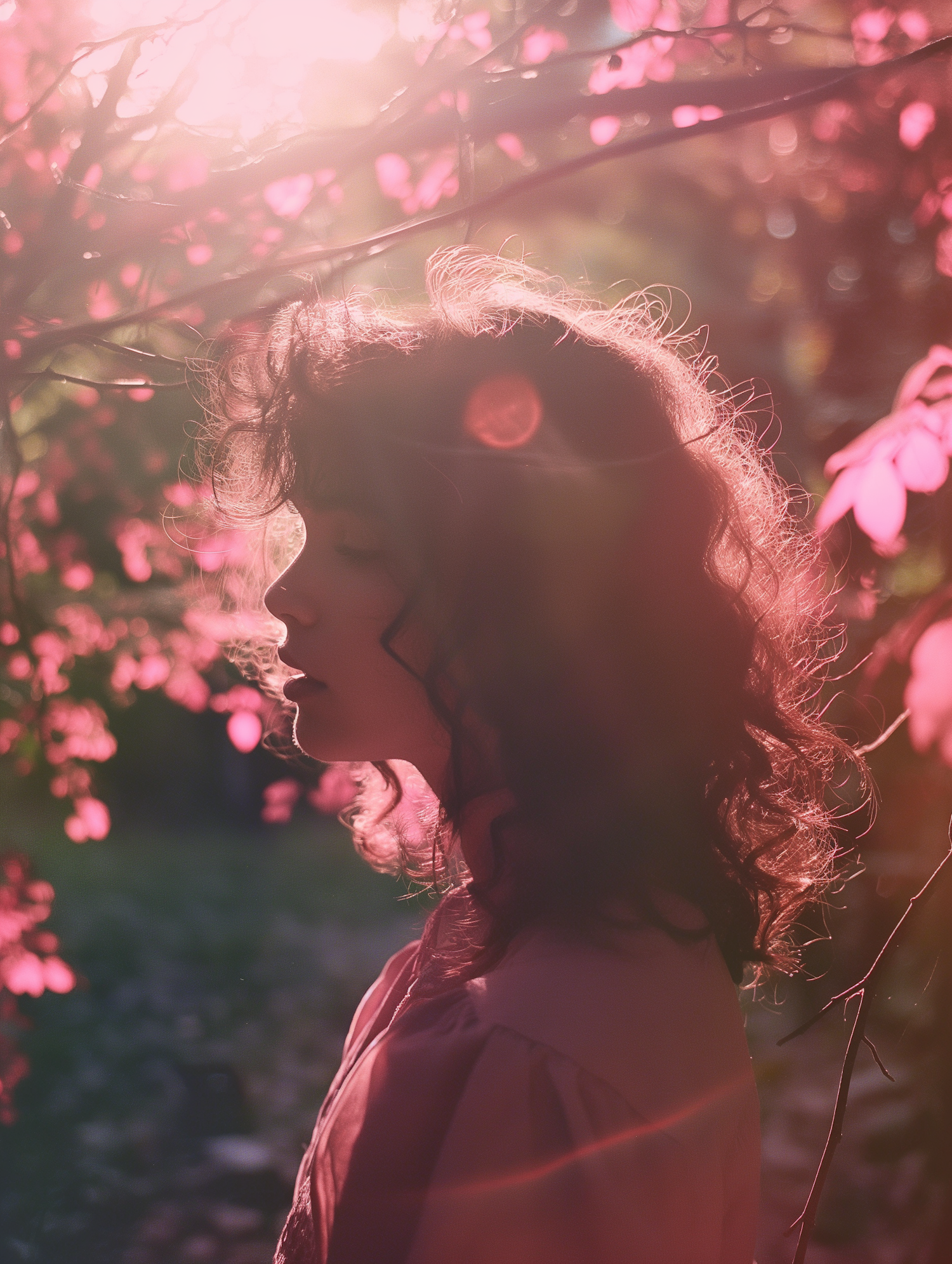 Serene woman with curly hair in a dreamy pink blossom setting, bathed in warm sunlight, creating a tranquil and ethereal atmosphere.