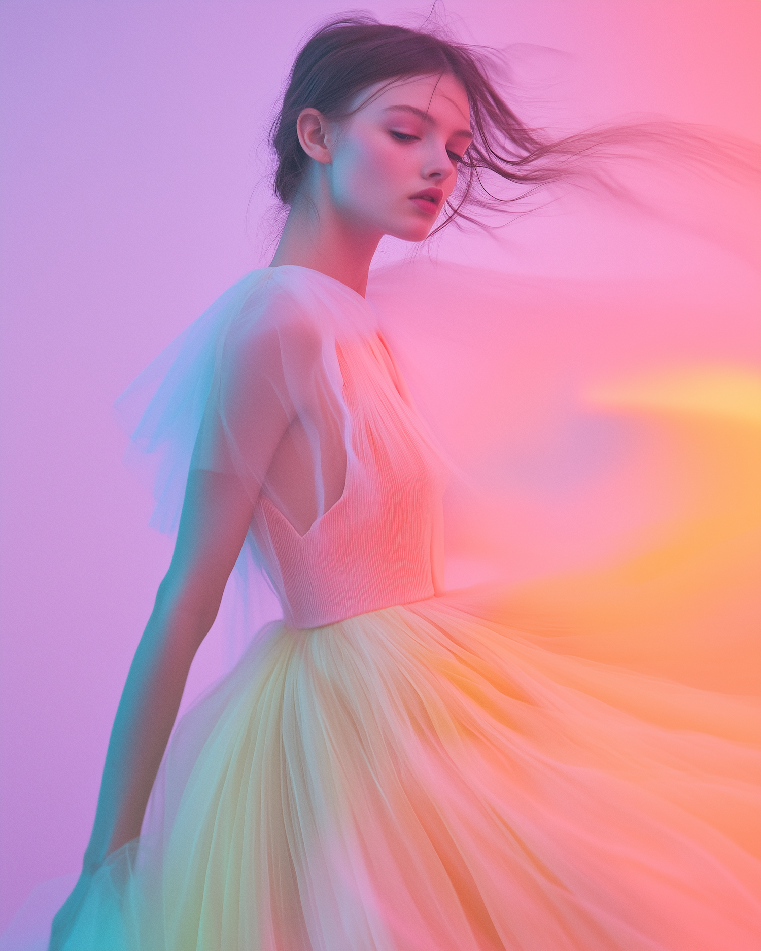 Ethereal portrait of a woman in a flowing pastel dress, blending with a dreamy gradient background.