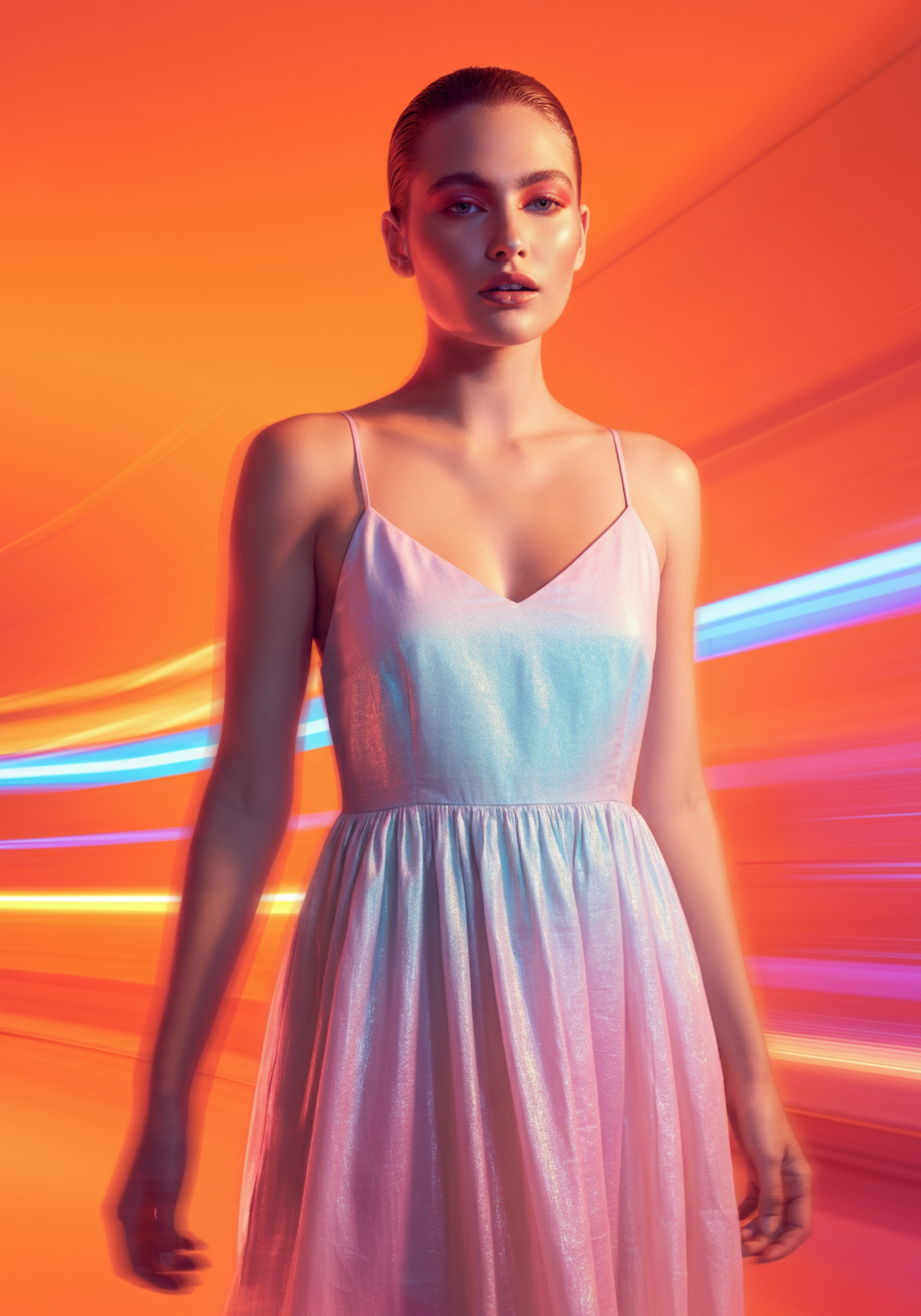 A young woman in a shimmering dress stands against a vibrant orange background with dynamic light streaks.