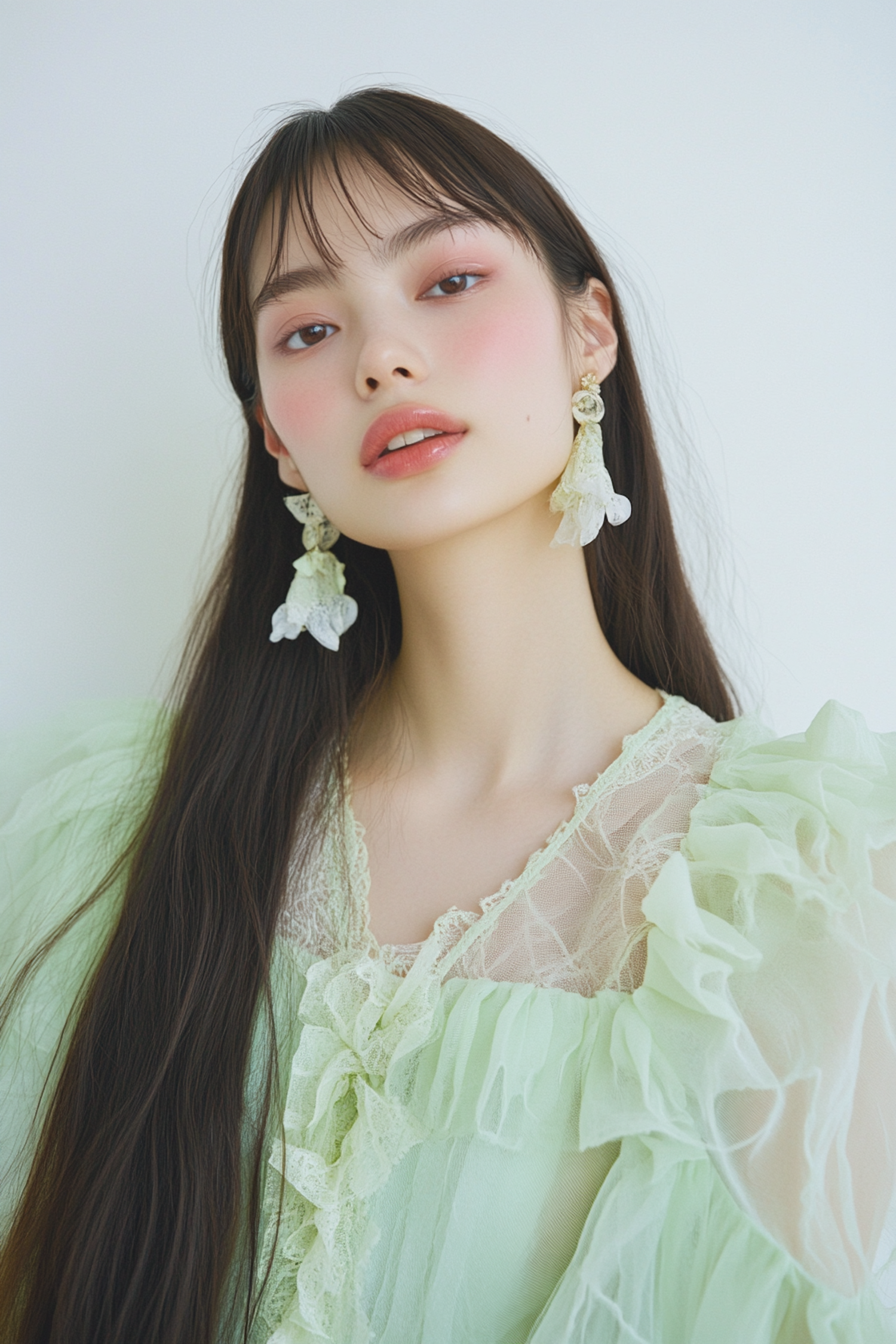 A serene portrait of a woman in a light green lace dress, with floral earrings and soft makeup, exuding elegance and natural beauty.