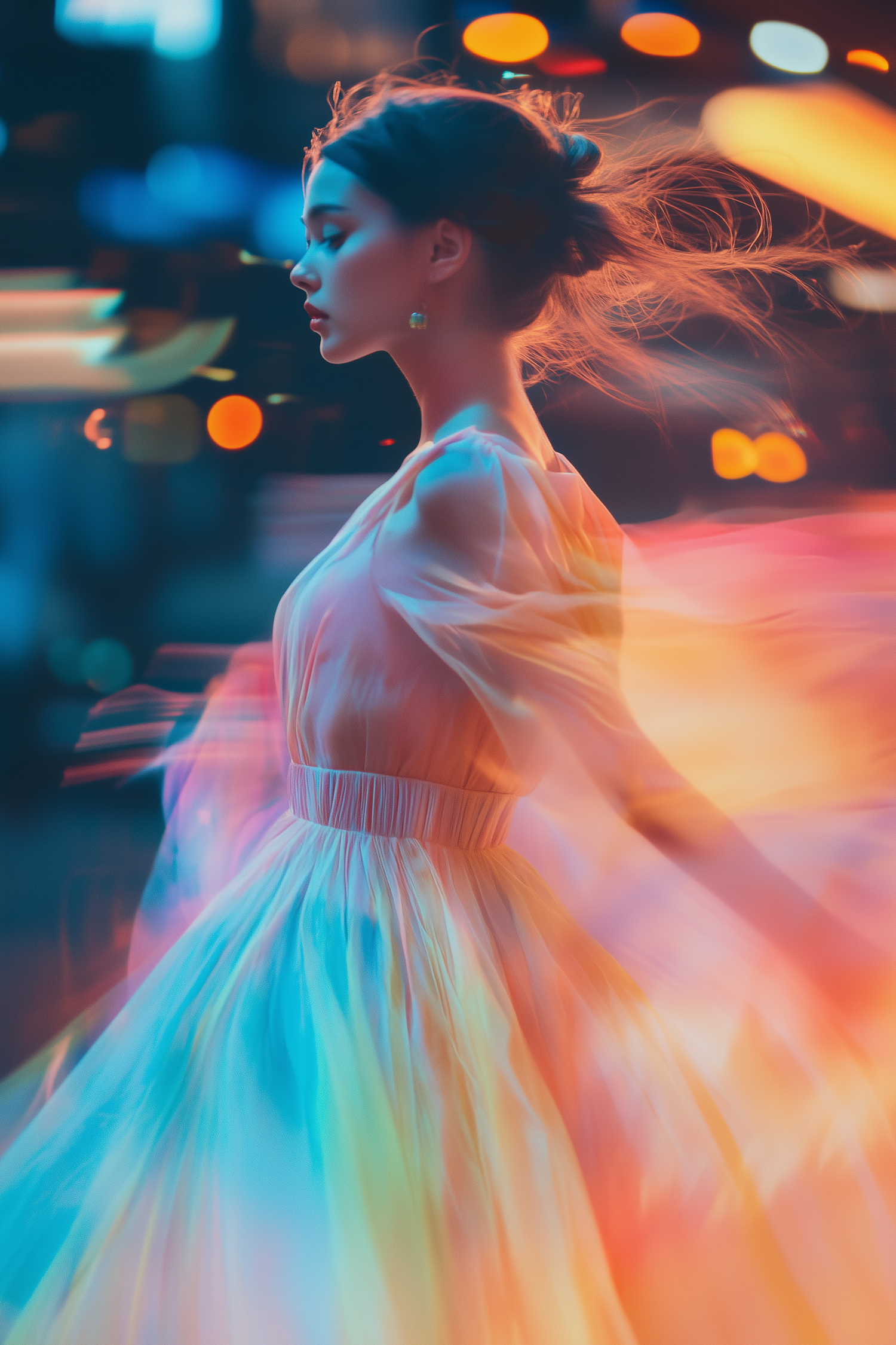 A serene woman in a flowing pastel dress surrounded by vibrant, dreamy bokeh lights, creating a magical and ethereal atmosphere.