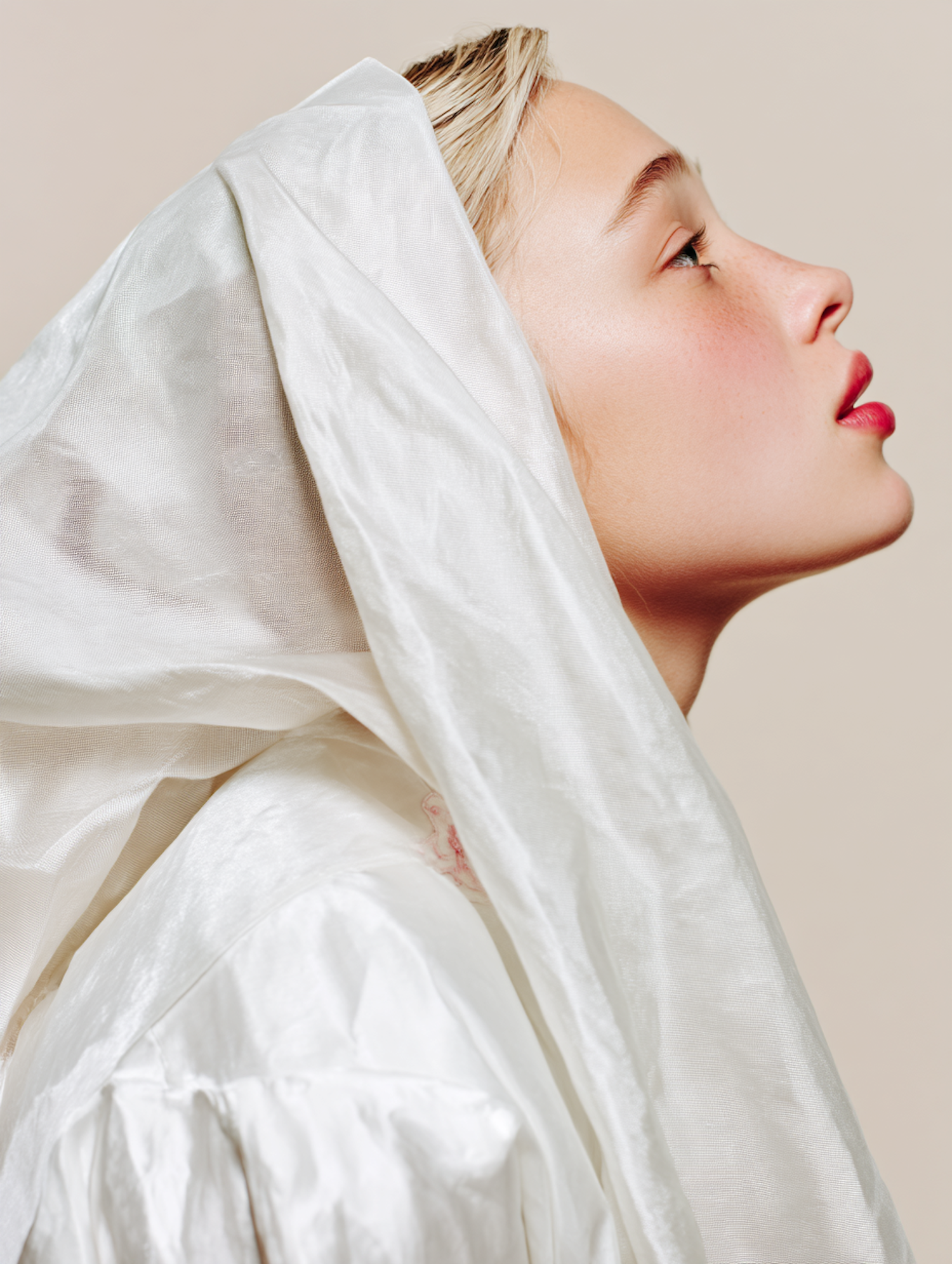 Side profile of a woman with fair skin and red lips, draped in sheer white fabric against a neutral beige background.