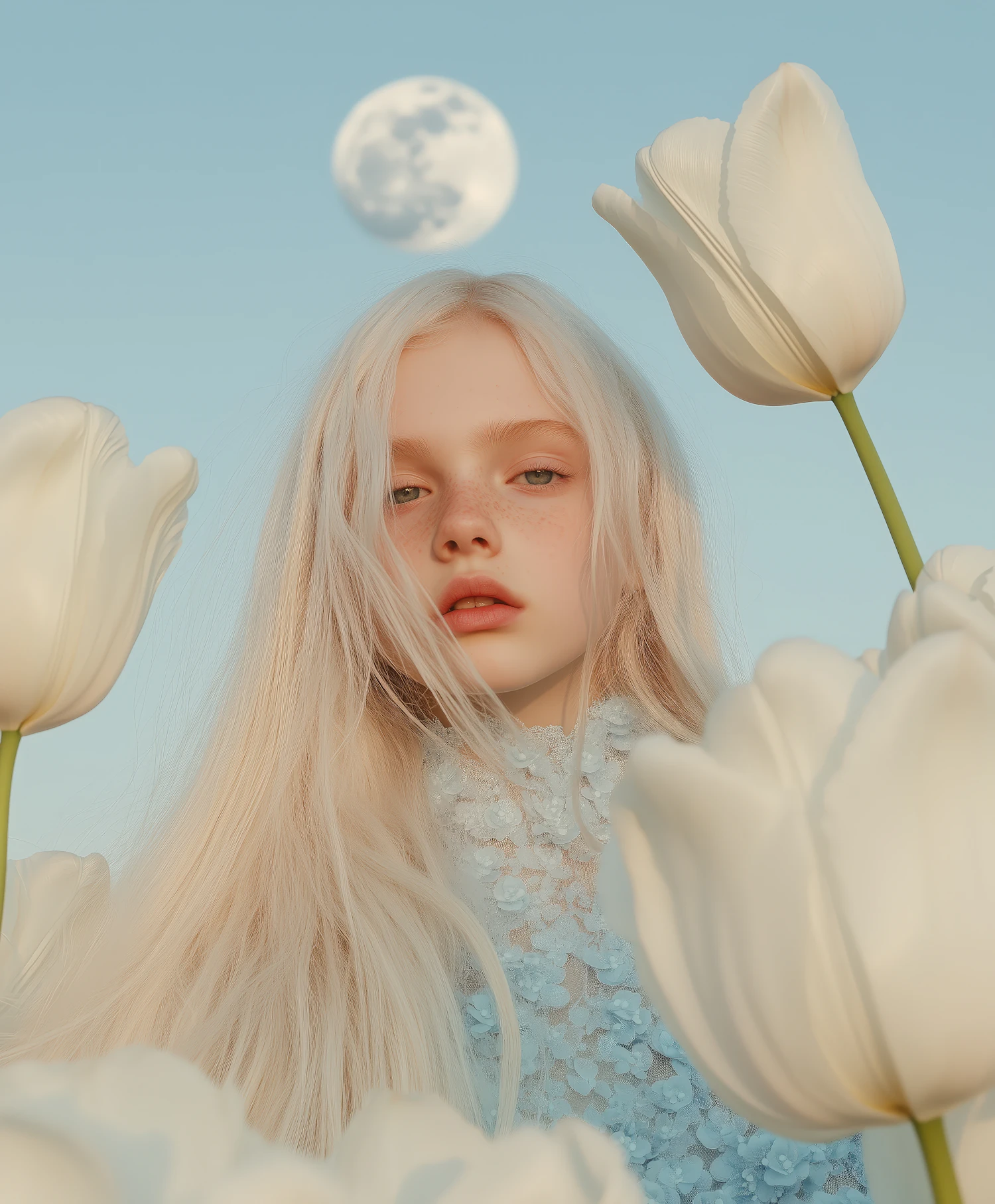 Dreamy portrait of a young woman with platinum blonde hair, white tulips, and a full moon in a serene blue sky. Ethereal and tranquil vibes.