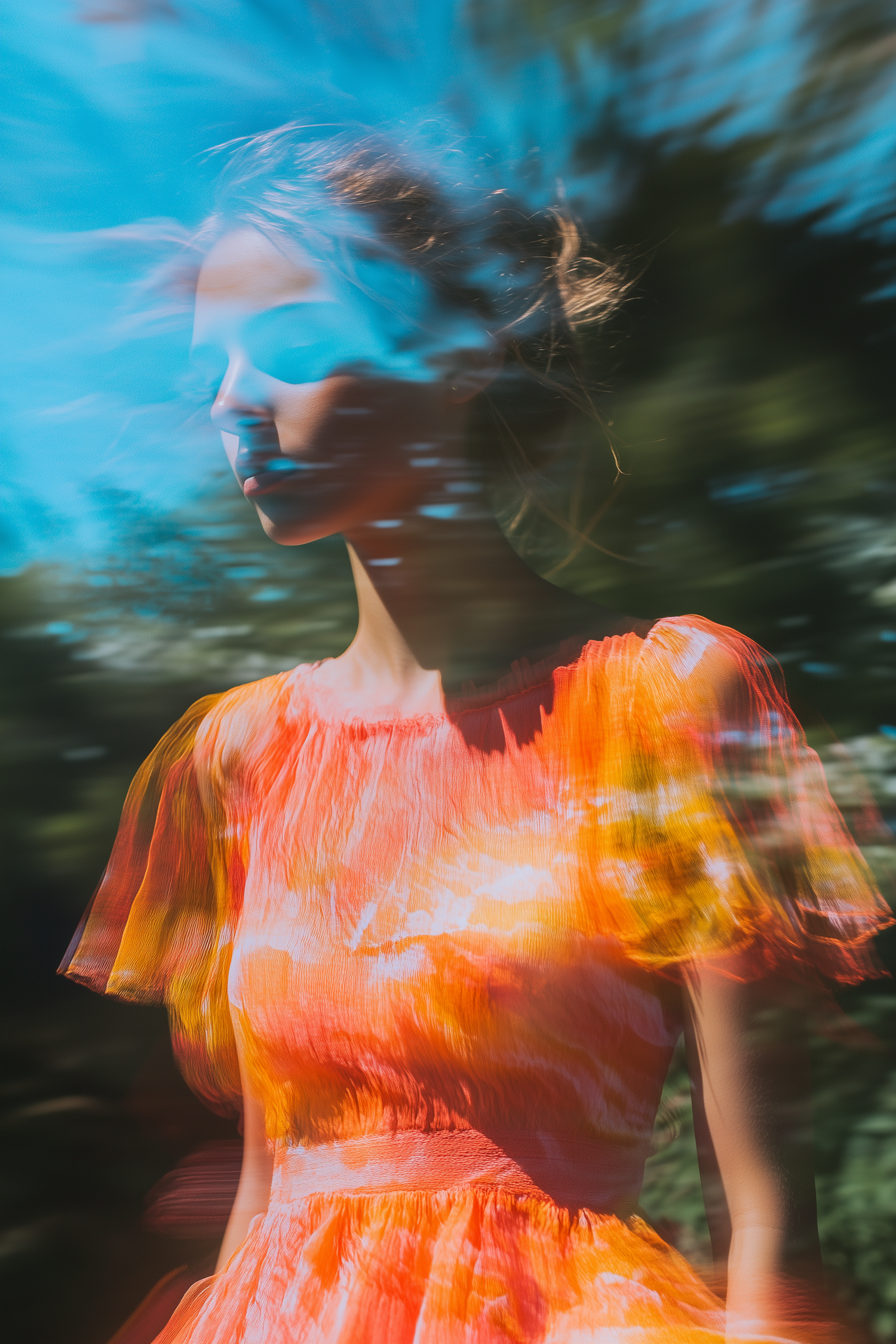 A serene woman in a vibrant orange-yellow dress, surrounded by dreamy blue and green blurred effects in a natural outdoor setting.