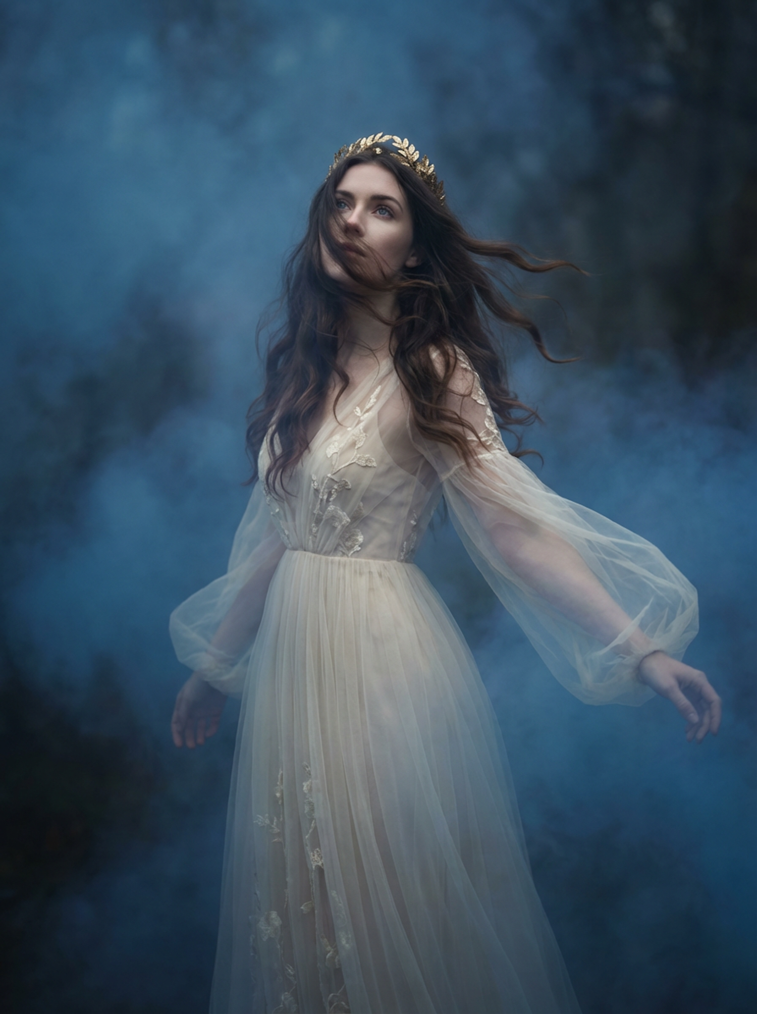 A woman in a flowing gown and golden crown stands in a misty, ethereal setting, exuding a serene and dreamlike presence.