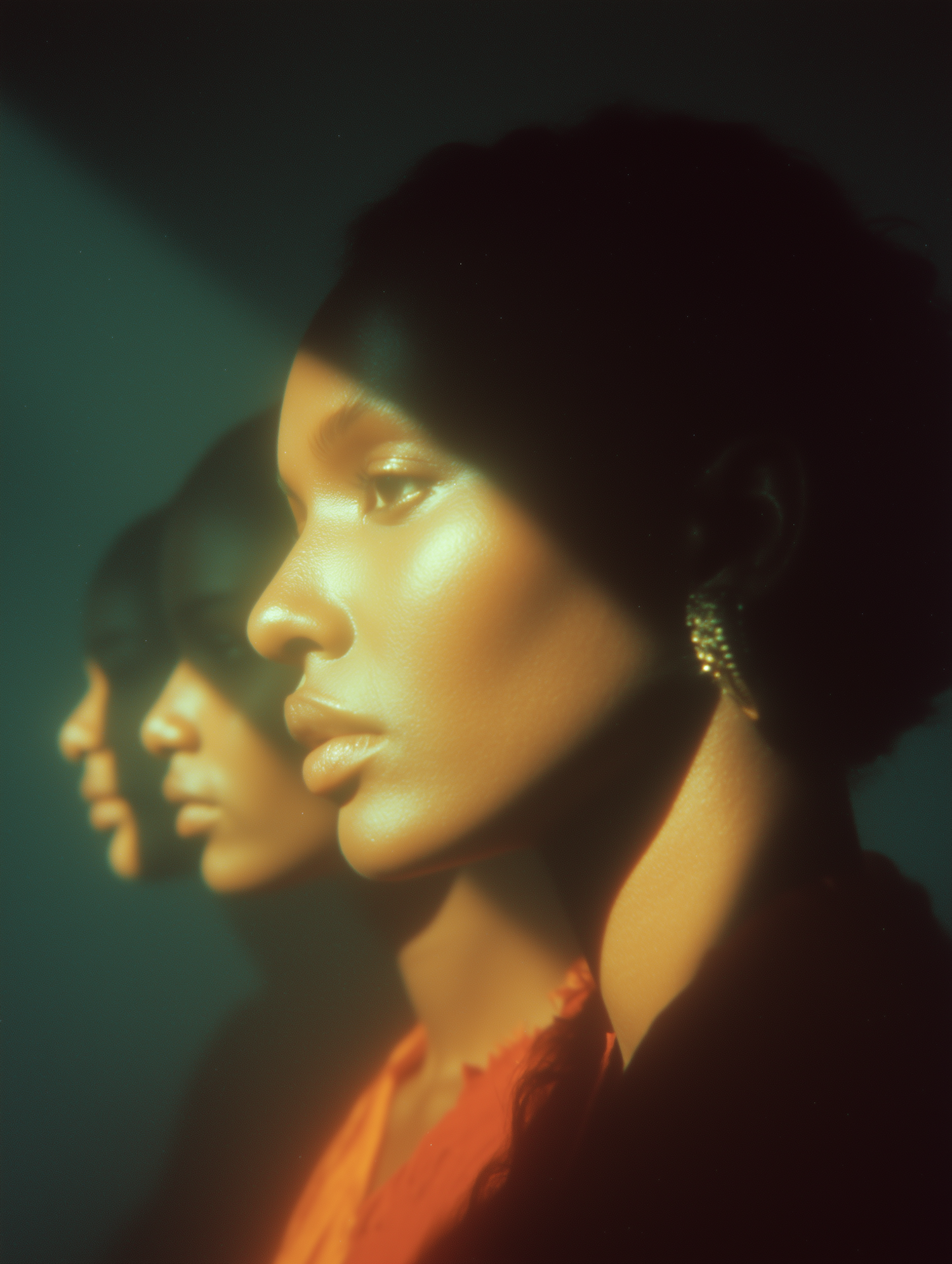 Dreamy portrait of a woman in soft light, wearing a red outfit and gold earring, with artistic reflections creating a surreal effect.