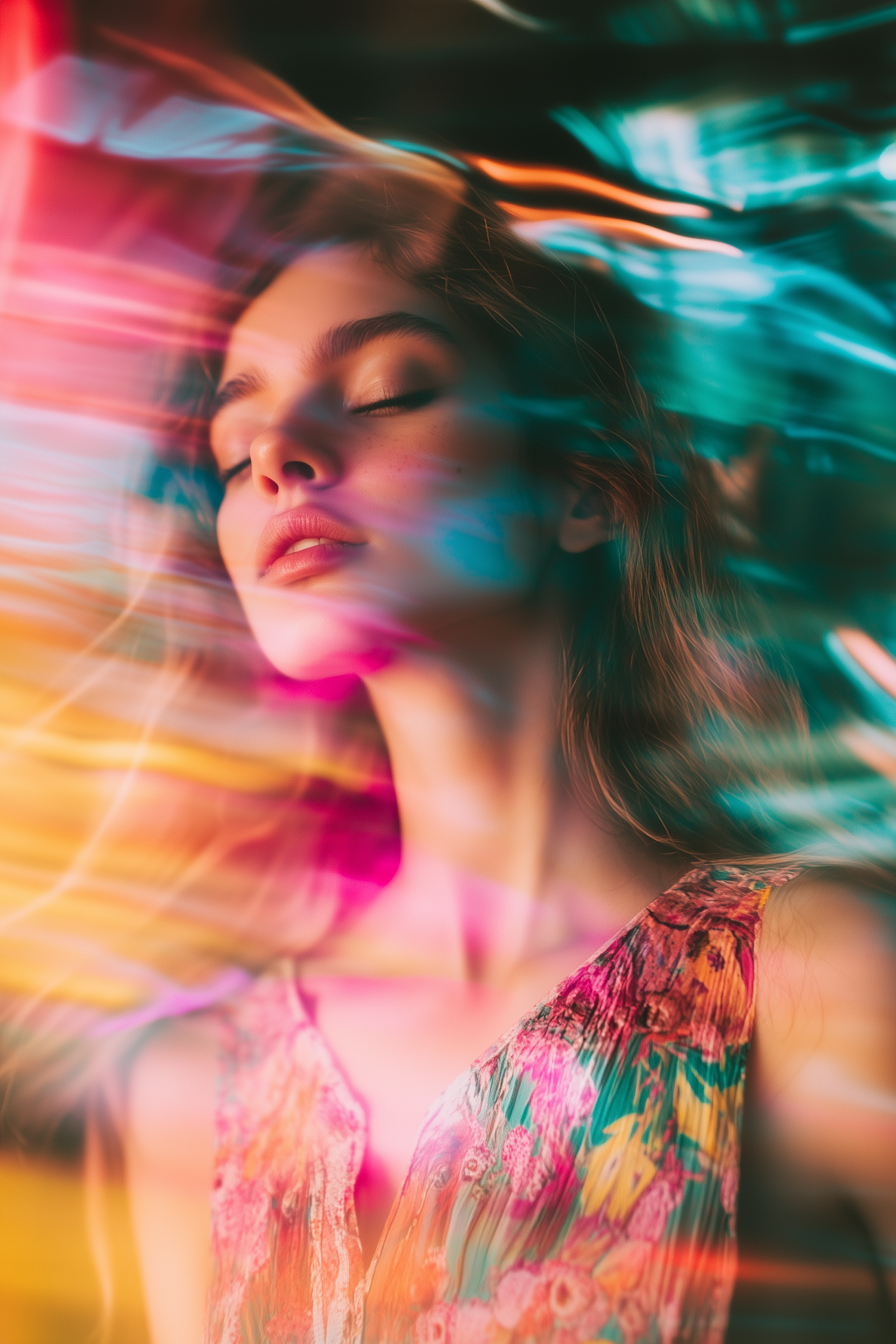 A serene woman in a floral dress surrounded by vibrant streaks of light in pink, teal, and yellow, creating a dreamy, ethereal vibe.