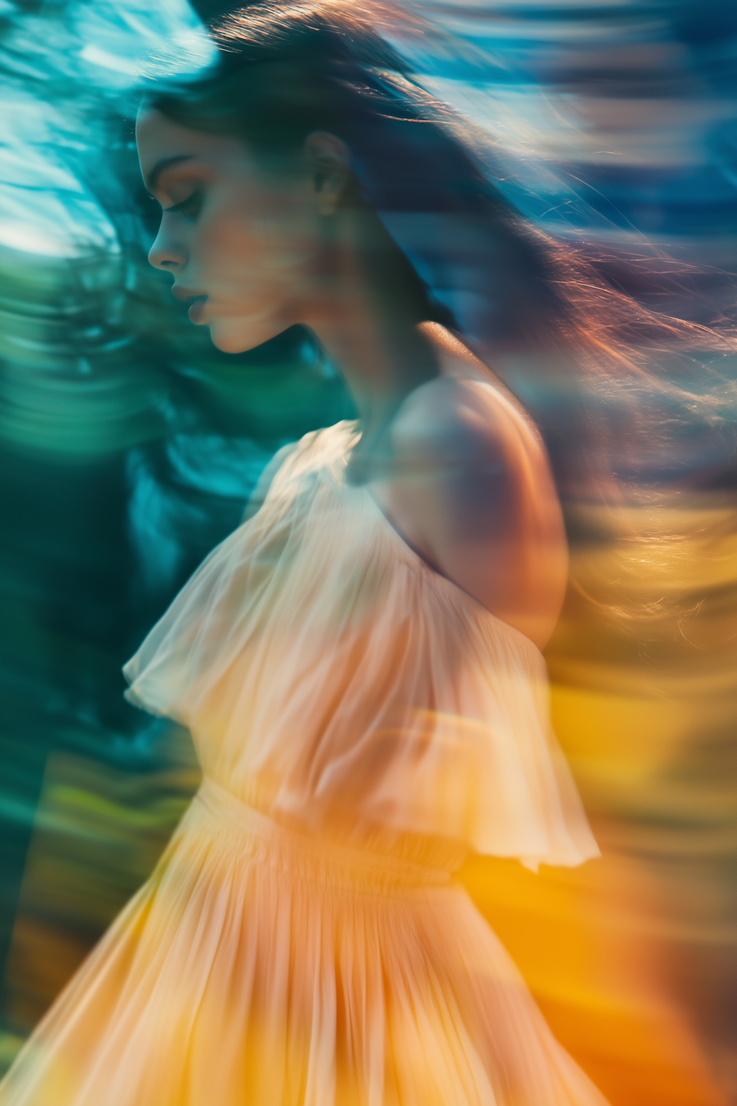 A dreamy portrait of a woman in a flowing dress, surrounded by swirling teal and orange hues, creating an ethereal, motion-filled effect.