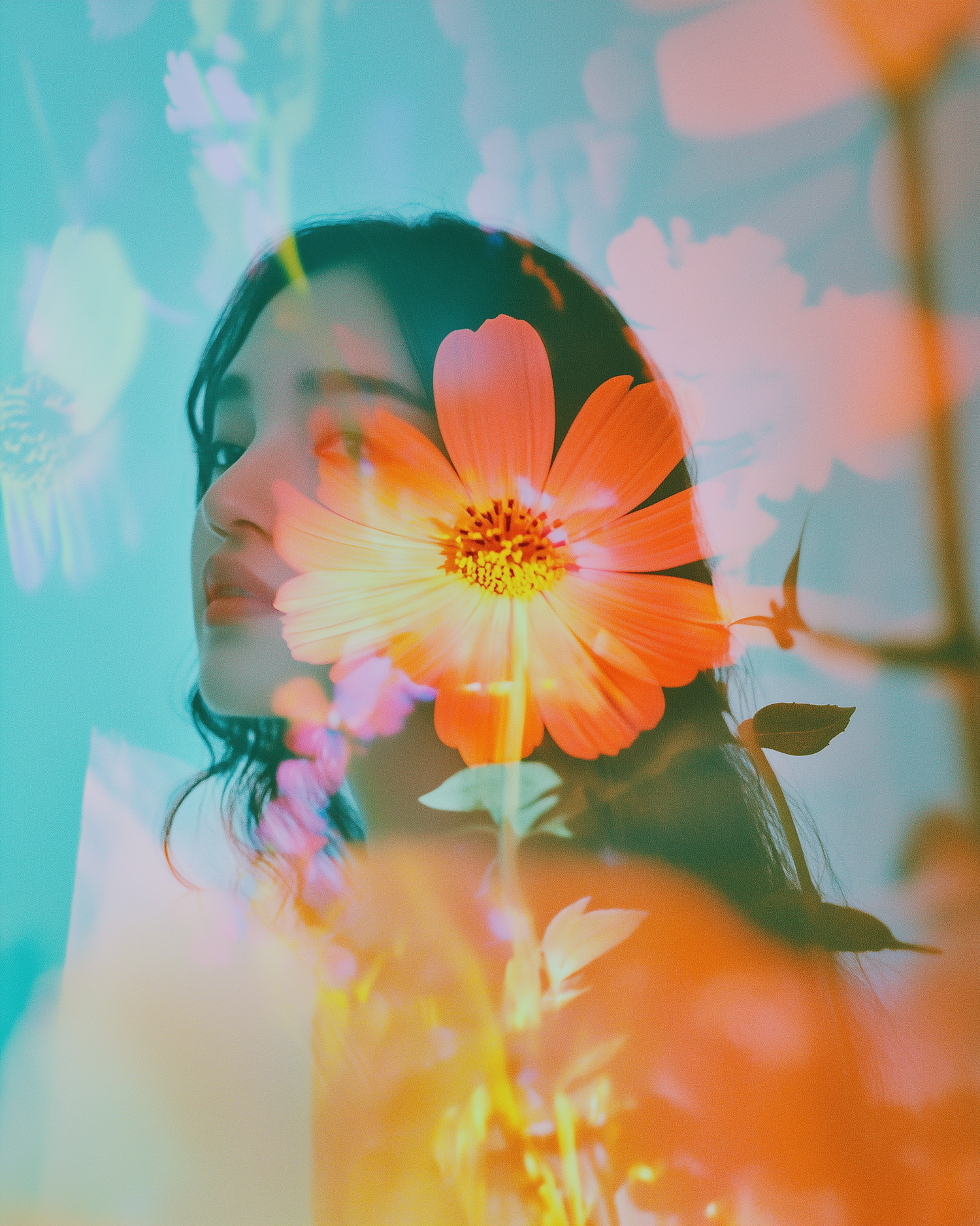 Double exposure of a woman's face with vibrant orange flowers, creating a dreamy, ethereal effect with soft turquoise and pastel hues.
