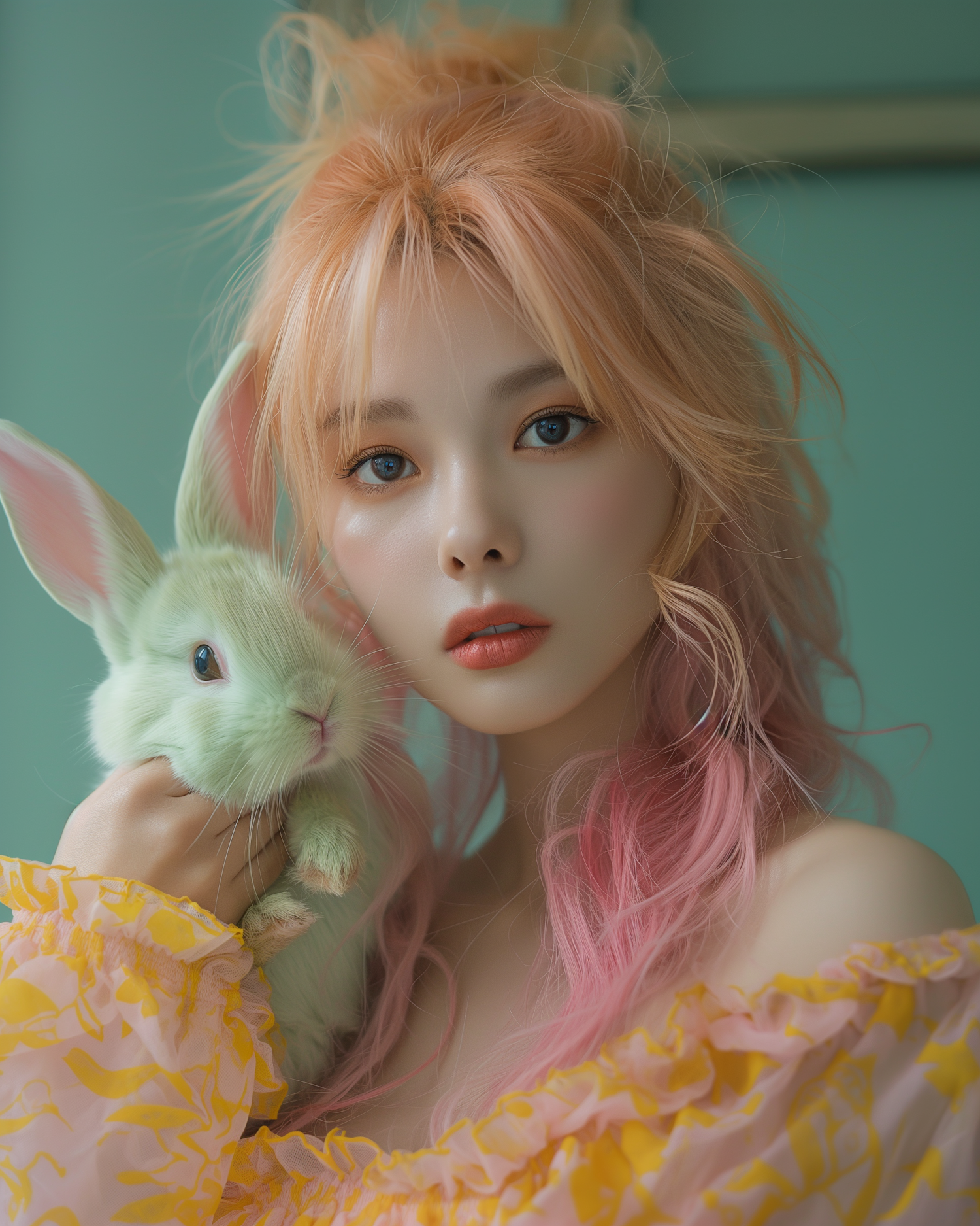 A serene portrait of a woman with pastel hair holding a fluffy rabbit, set against a soft teal background.