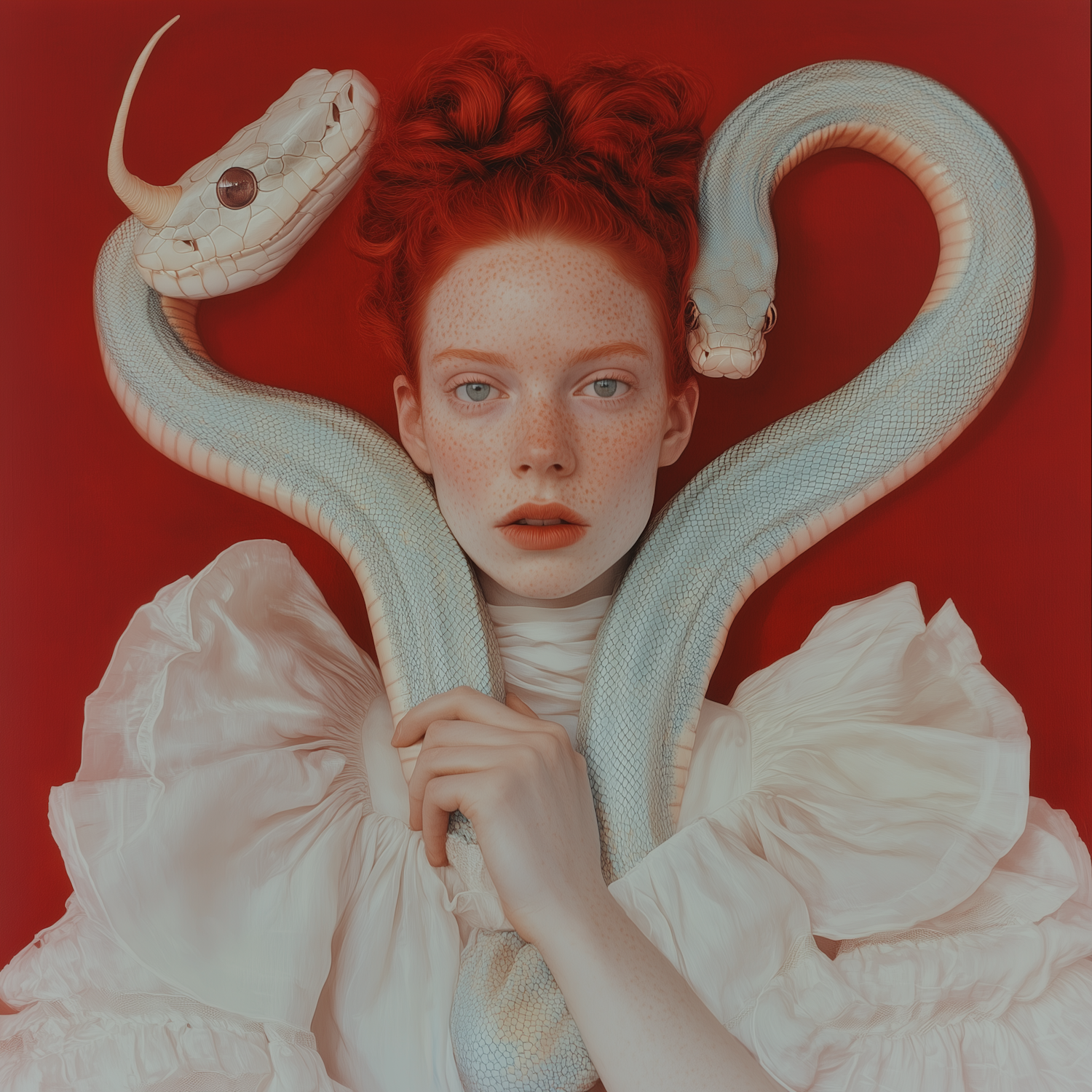 A striking portrait of a red-haired woman with a pale blue snake around her shoulders, set against a bold red background.