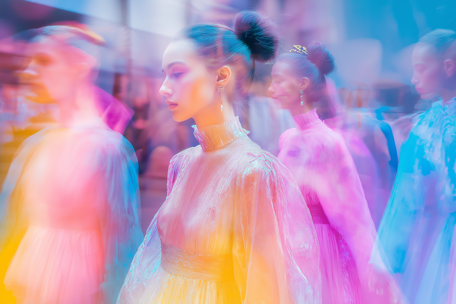 Ethereal women in flowing, iridescent dresses with dreamy pastel hues and blurred motion effects, creating a surreal, artistic vibe.
