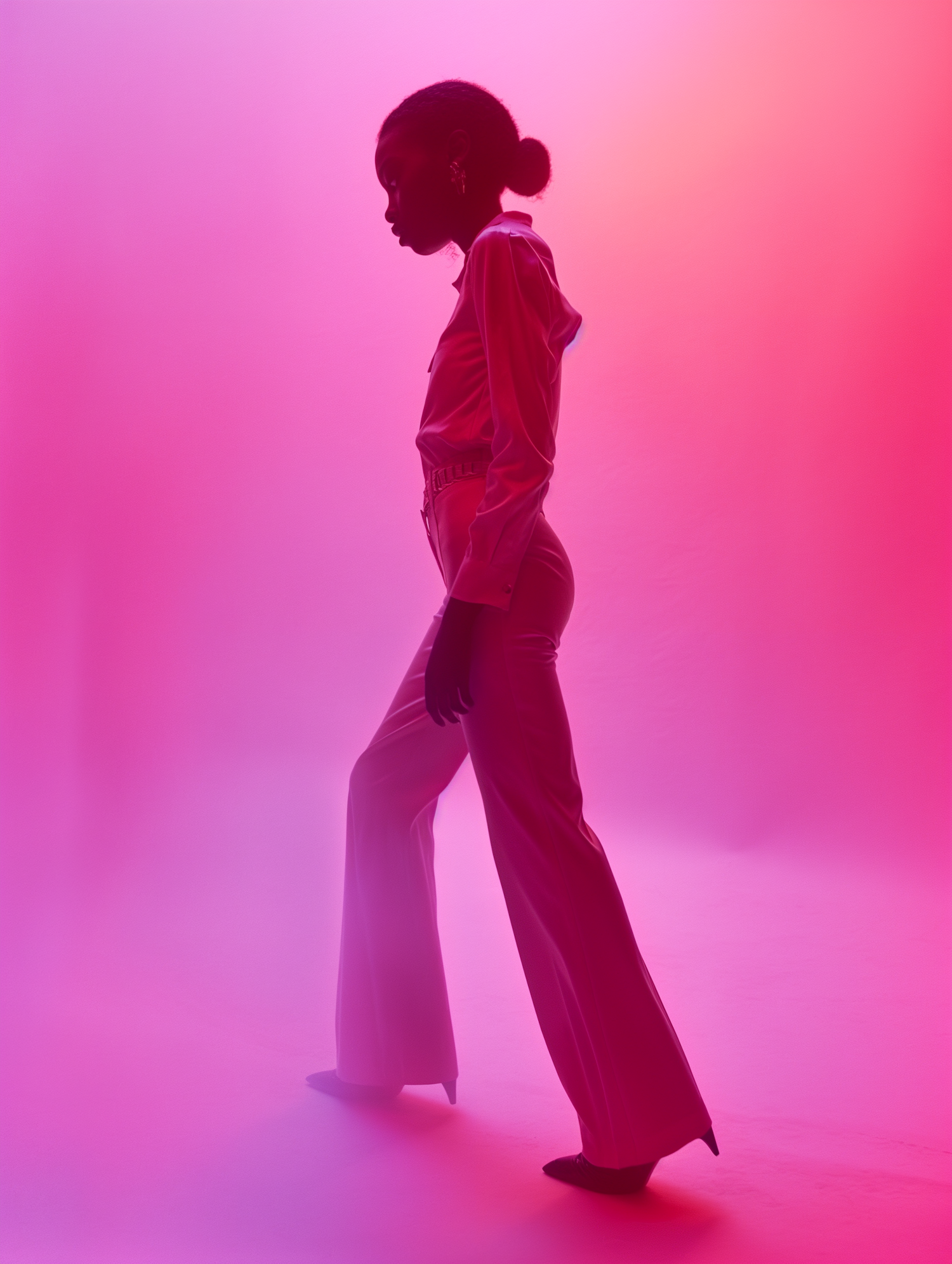 Silhouette of a woman in stylish attire against a vibrant pink gradient background, showcasing elegance and fashion-forward style.