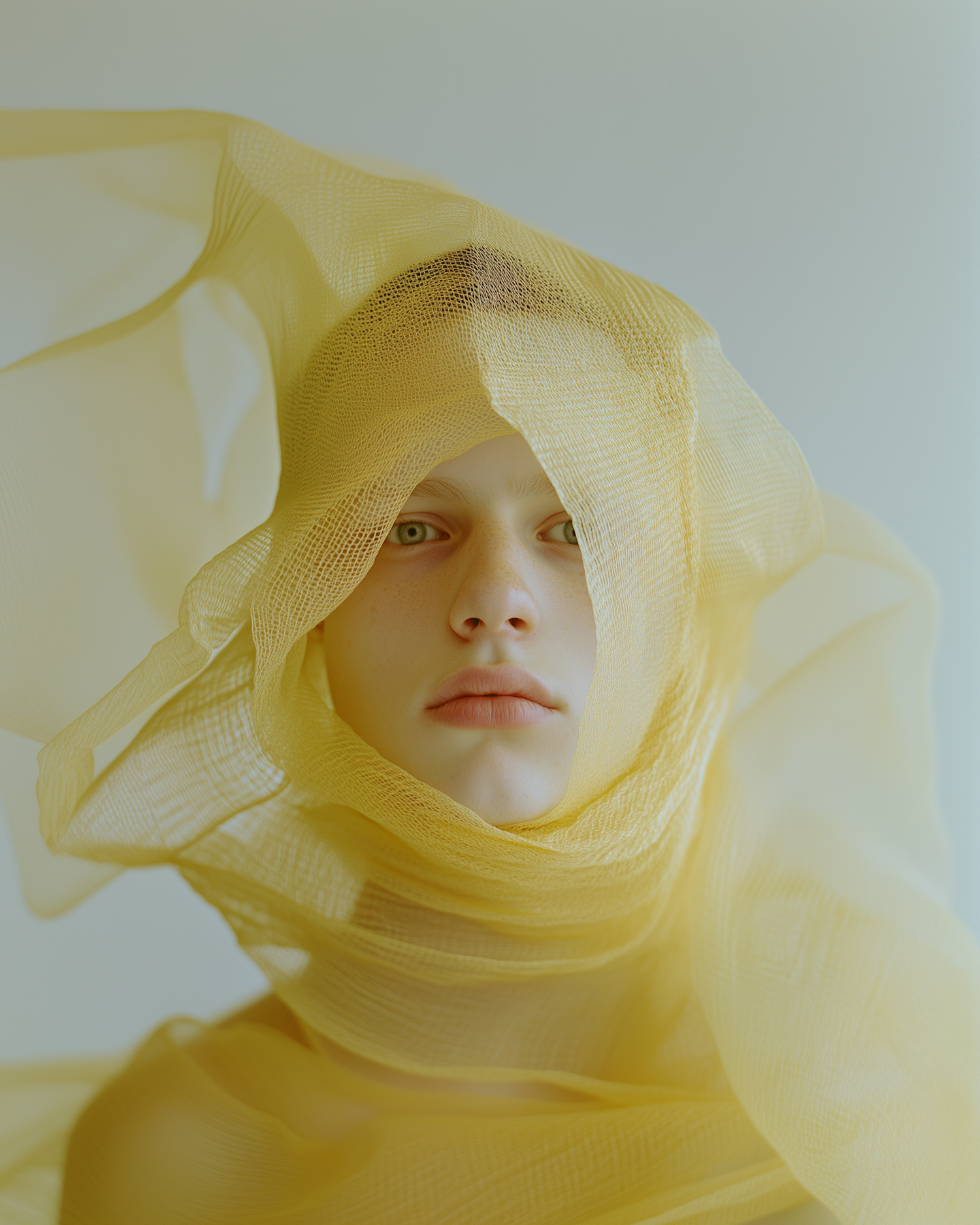 Ethereal portrait of a person wrapped in flowing yellow fabric, with soft lighting and a serene, artistic vibe.