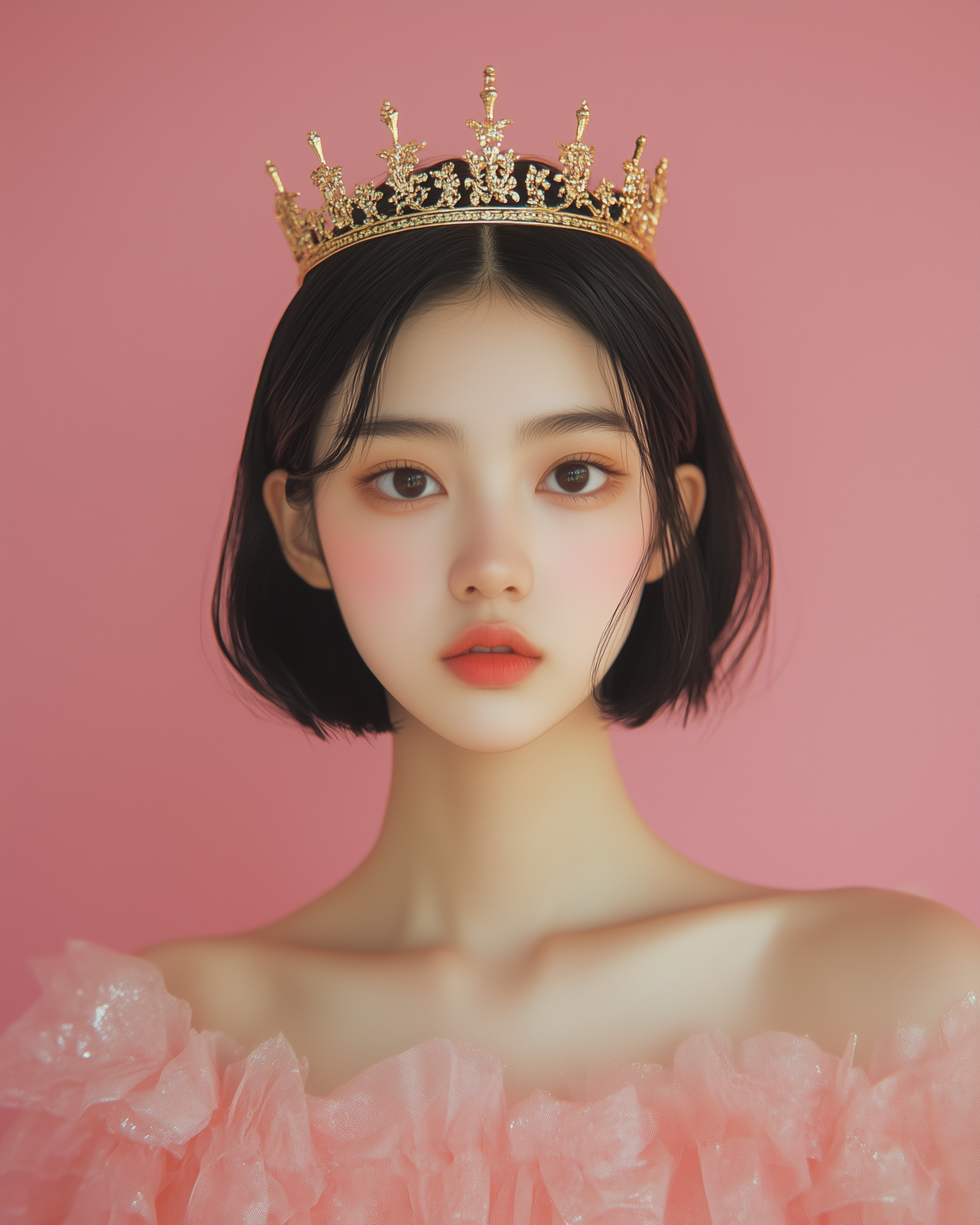 Elegant portrait of a young woman with a golden crown and pink ruffled dress against a soft pink background.