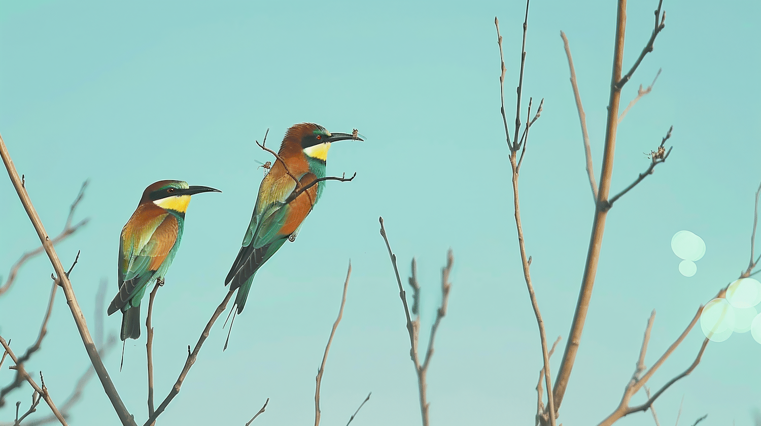 Two colorful European bee-eaters perched on branches against a clear blue sky, one holding an insect. Vibrant plumage and serene setting.