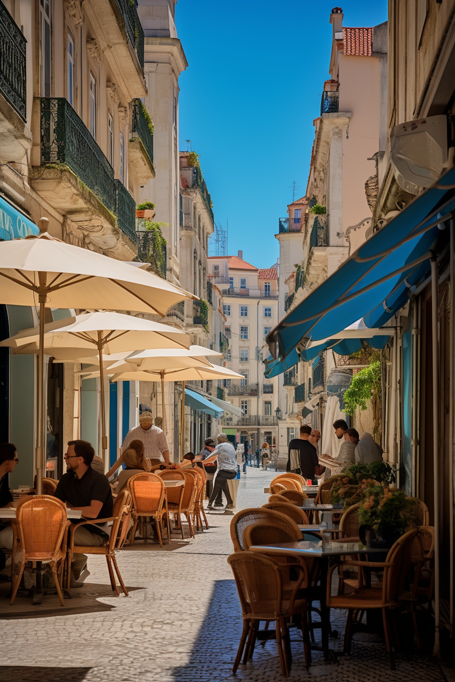 Charming European street with outdoor cafes, cobblestone alley, and vibrant blue sky. People enjoy a sunny day under large umbrellas.