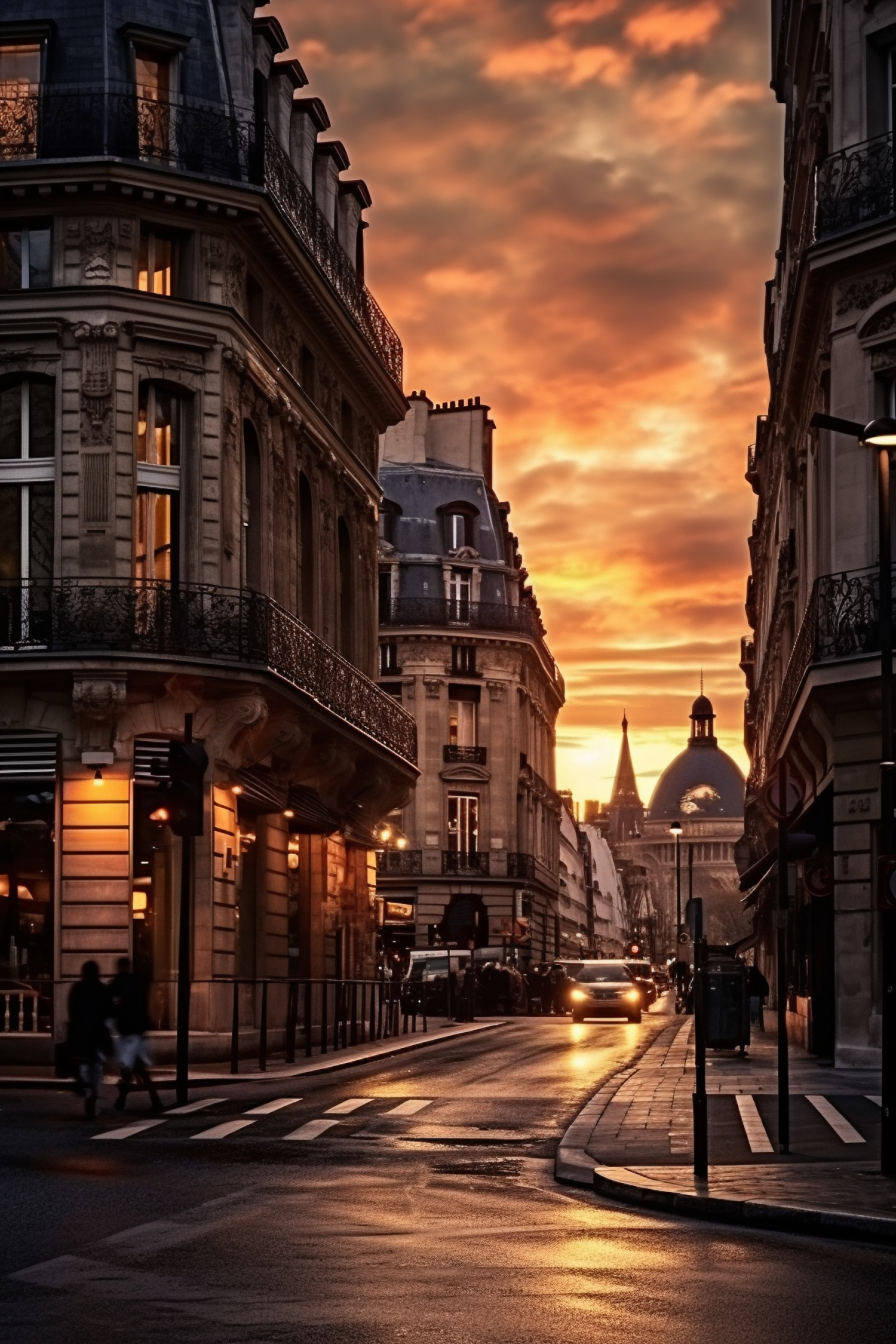 Charming European street at sunset with classic architecture, glowing streetlights, and a vibrant sky. A car and pedestrians add life.