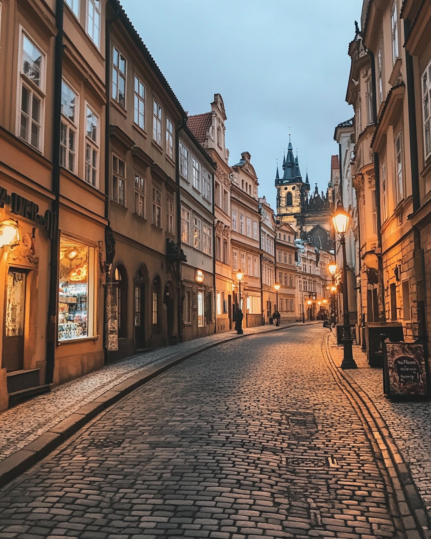 Charming cobblestone street in a historic European city, lined with warm-toned buildings and glowing street lamps, leading to a Gothic church.