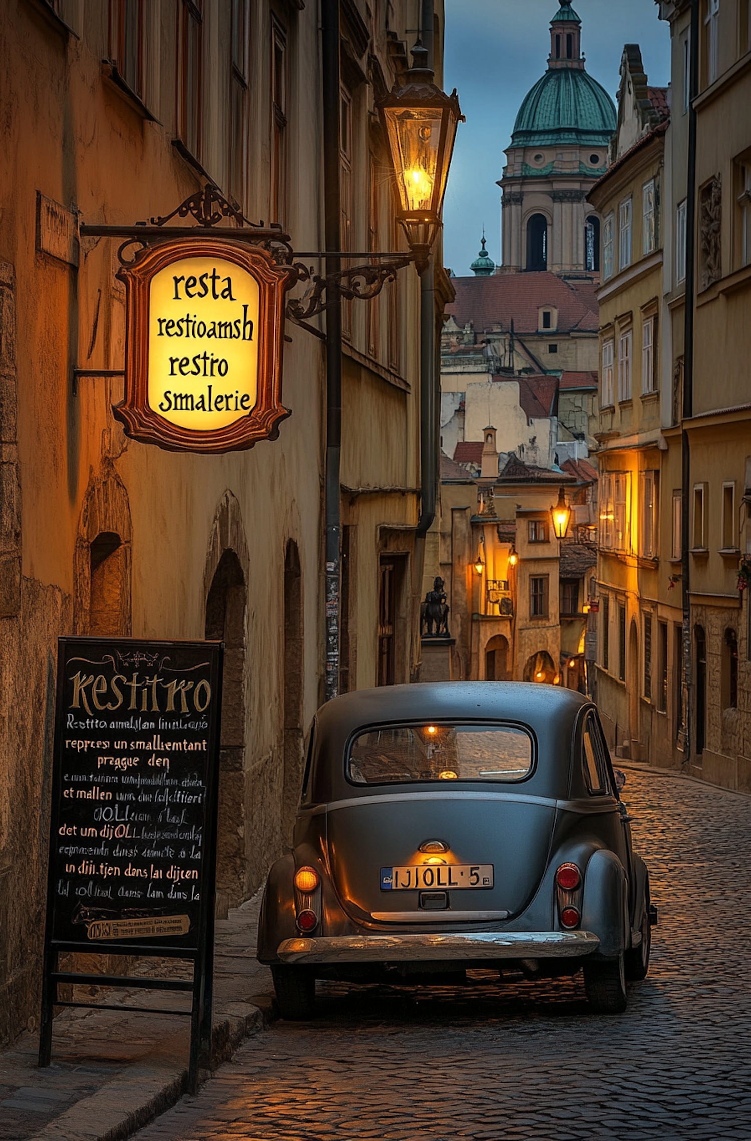 Charming cobblestone street with vintage car and glowing street lamps, set against historic European architecture and a domed building.