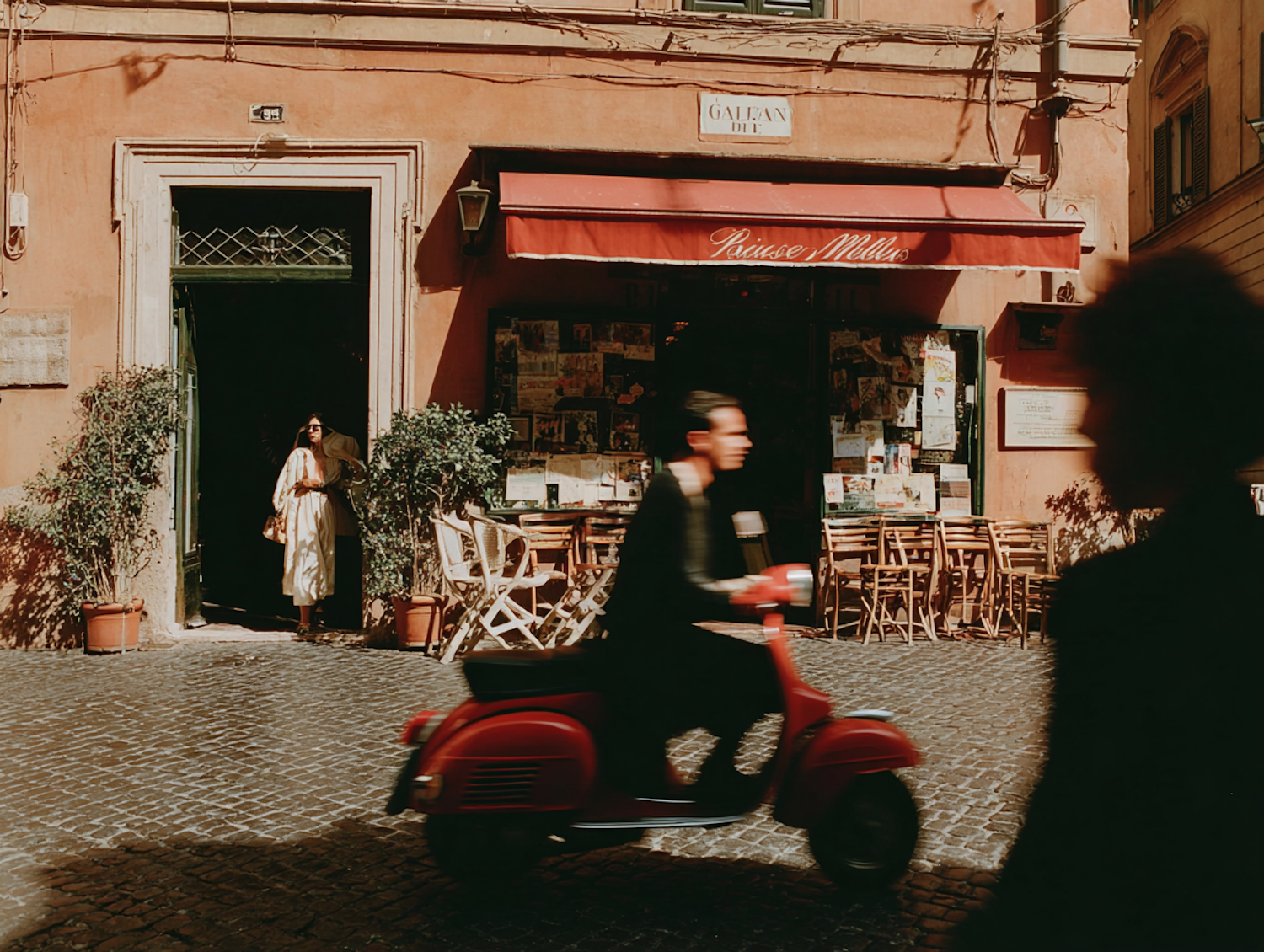 A vibrant street scene with a red scooter, a café with outdoor seating, and a woman stepping out of a doorway on a sunny day.