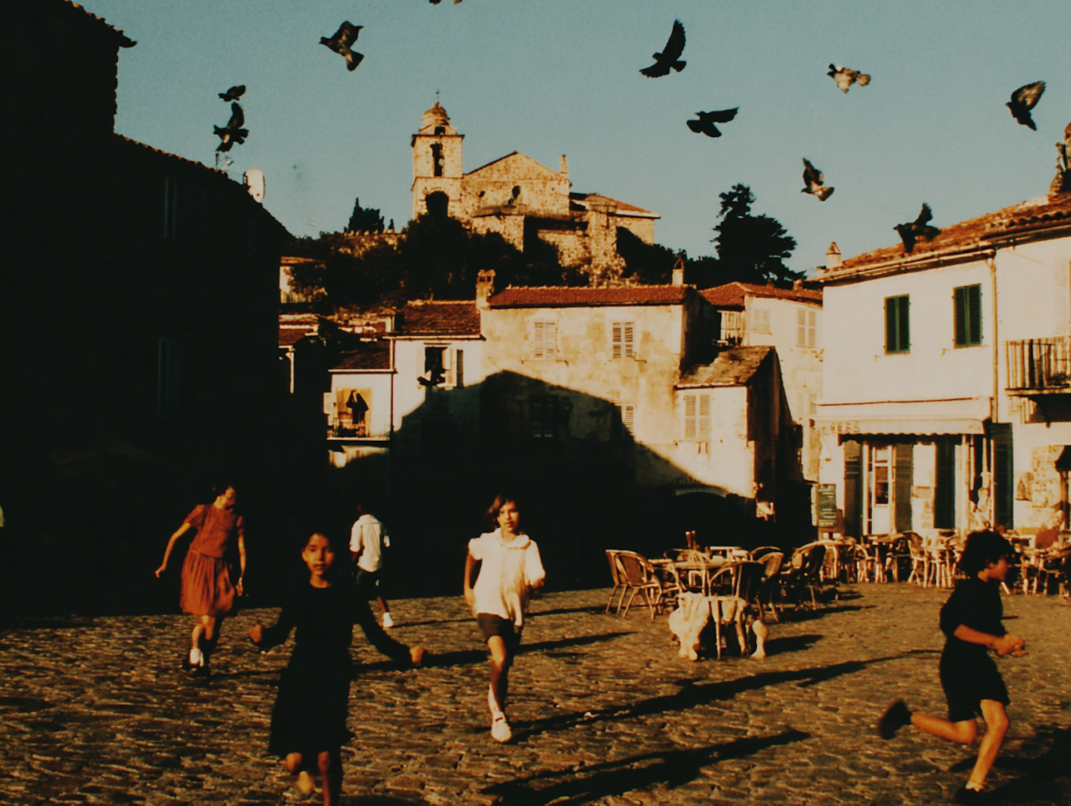 Children play in a sunlit European square with pigeons flying overhead, surrounded by rustic buildings and a historic church in the background.