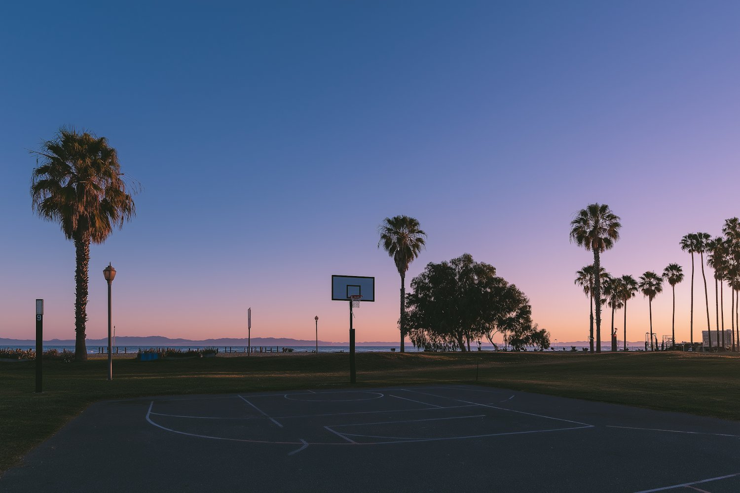 Palm trees silhouetted against a twilight sky adorn a serene park by a Venice basketball court, with distant mountains beyond the water.