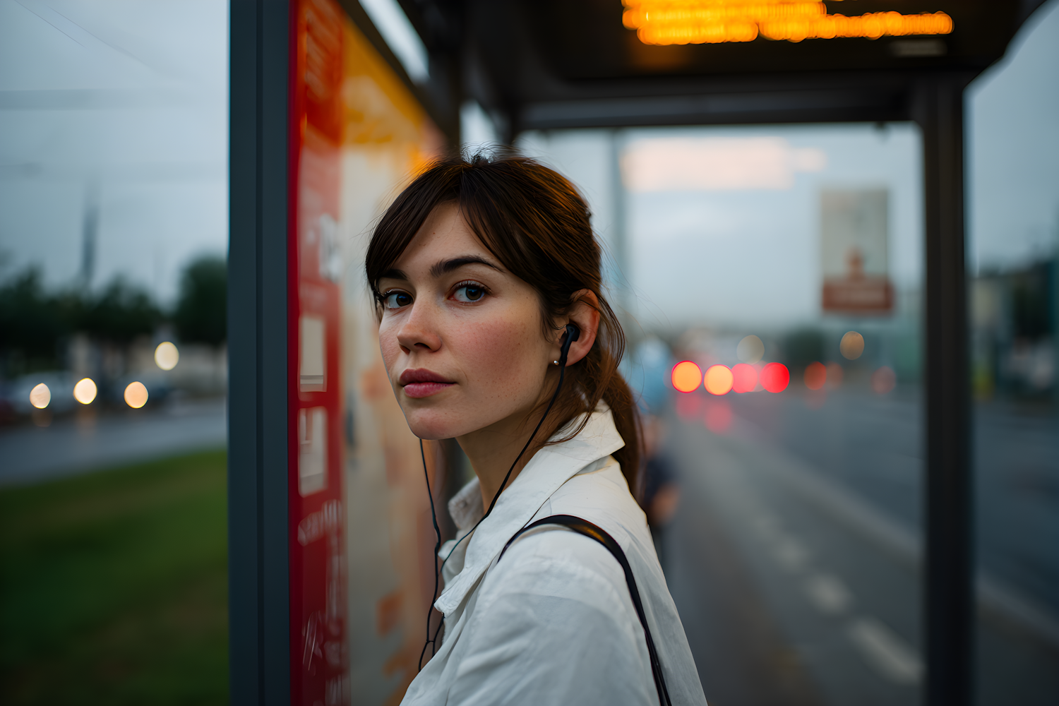 A young woman at a bus stop in the evening, wearing earphones and a white shirt, with blurred city lights in the background.