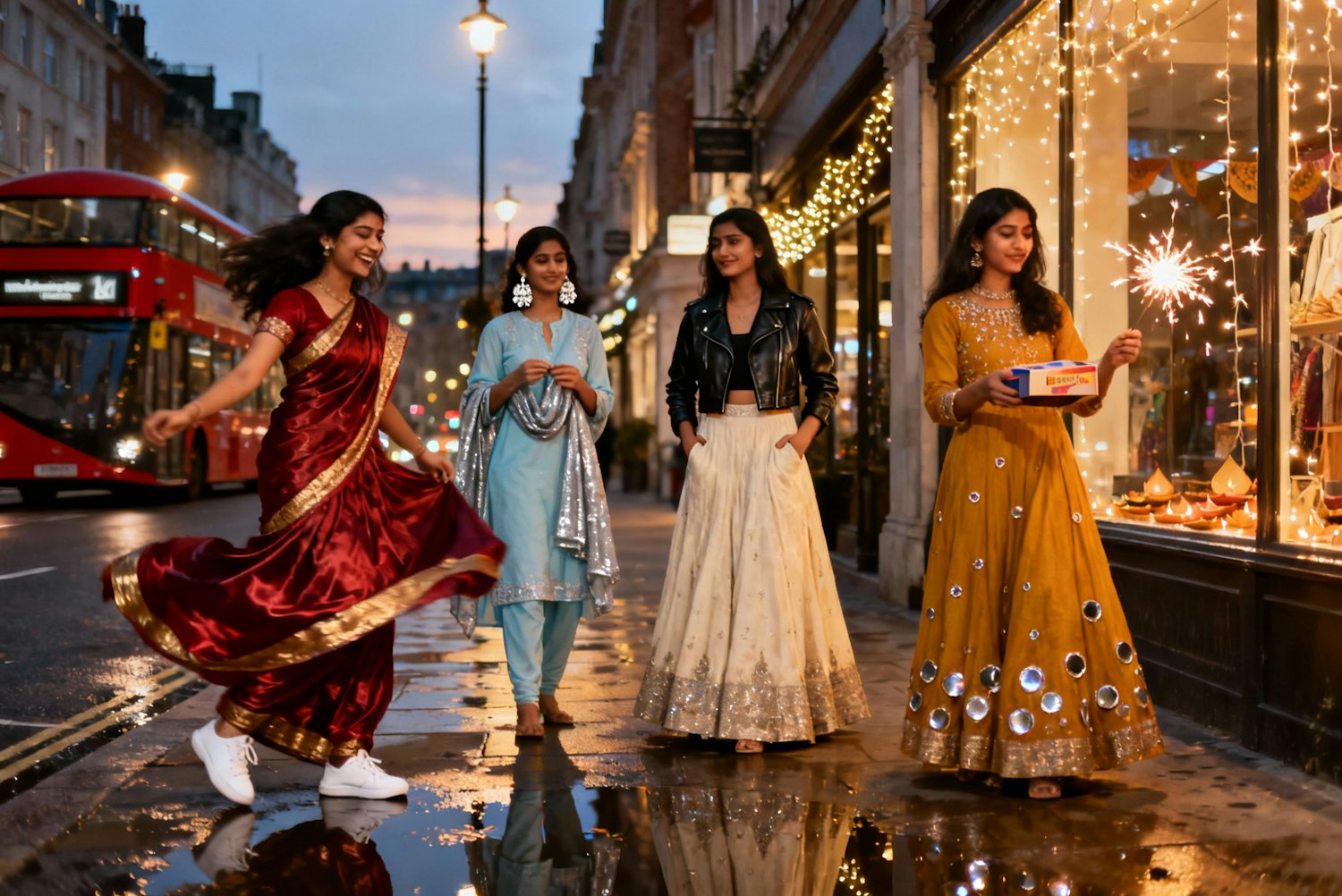 Four young women stand on a quiet London street at dusk, taking turns doing an “outfit check” for the camera, each framed by the soft glow of streetlights and rows of fairy lights strung along nearby shop windows. The first woman wears a deep red silk saree with gold borders, paired playfully with white sneakers — she laughs mid-spin, the fabric catching the light as a bus passes behind her. Next to her, a woman in a pastel blue kurta set with silver jhumkas adjusts her dupatta, the motion natural and unposed. The third wears a modern twist — a cream lehenga skirt with a cropped leather jacket — her hands tucked into the pockets, smiling with quiet confidence. The fourth, in a mustard-yellow anarkali with delicate mirror work, holds a small box of sparklers, one flickering to life as she waves it gently. The pavement glistens slightly from a recent drizzle, and the city lights reflect off puddles around their feet. The atmosphere feels effortlessly urban yet festive — a blend of Diwali warmth and London cool, captured in candid, natural light with the kind of joyful imperfection that makes the moment feel alive.