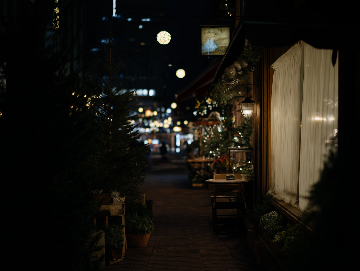 Quaint evening street during Christmas Market with a warmly lit shop, decorated with festive lights and evergreen trees, creating a cozy and inviting ambiance.